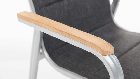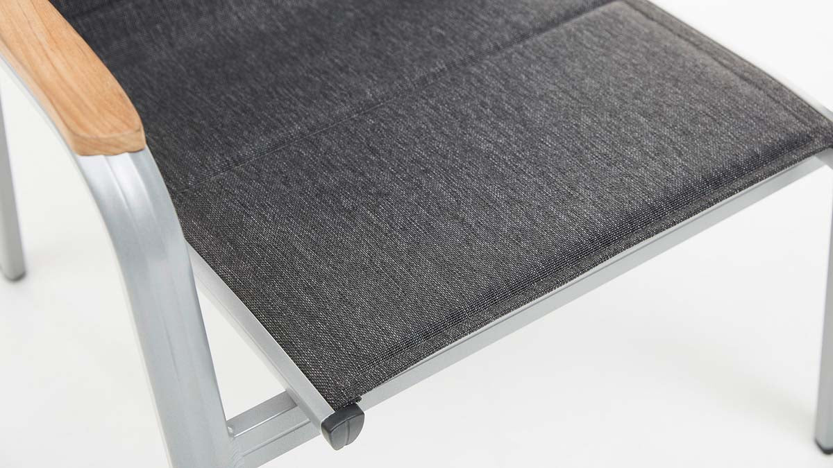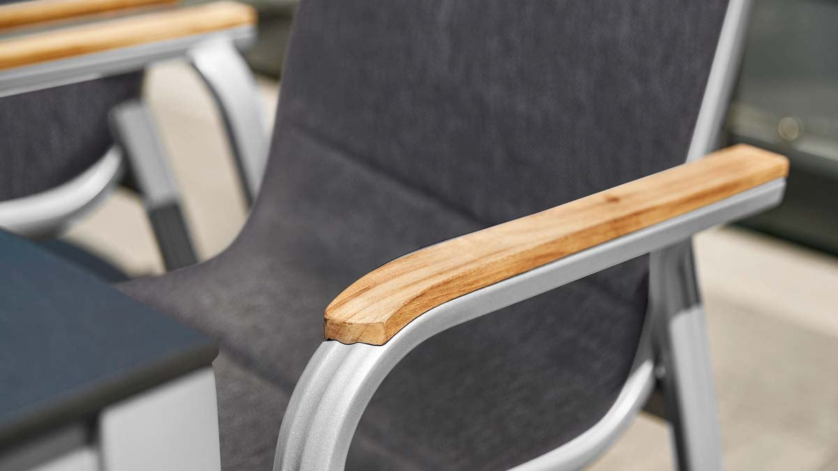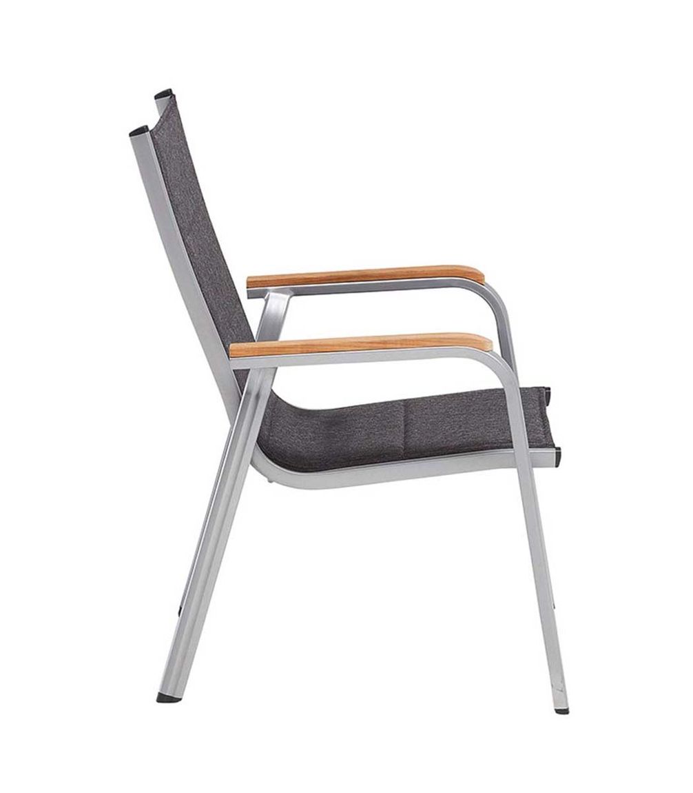 • • formschönes Aluminiumgestell mit Armlehnen aus 100% Teakholz (FSC zertifiziert)