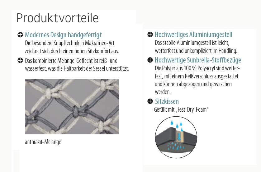 • • die besondere Knüpftechnik in Makramee-Art zeichnet sich durch einen hohen Sitzkomfort aus