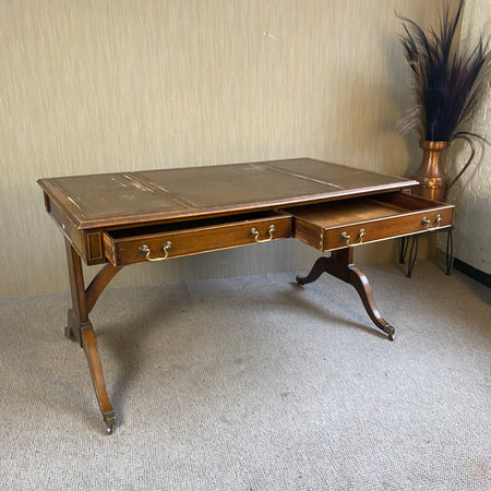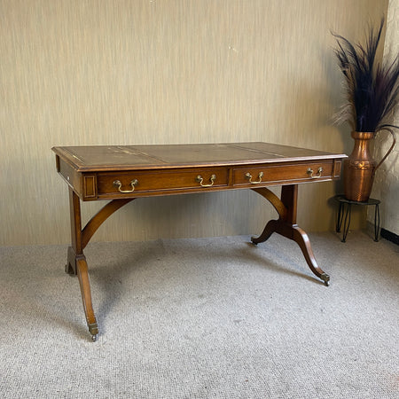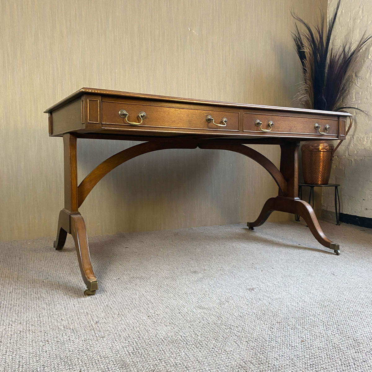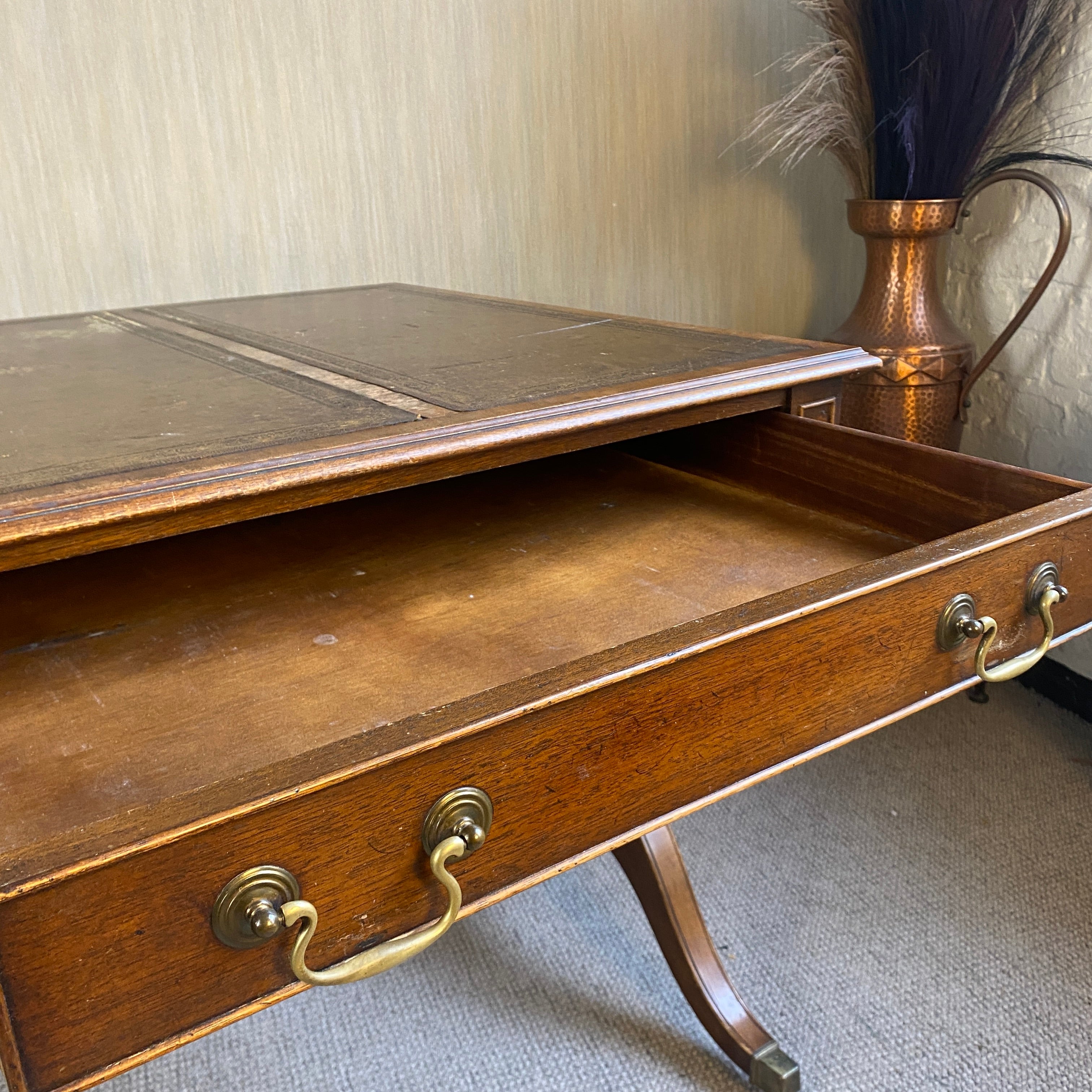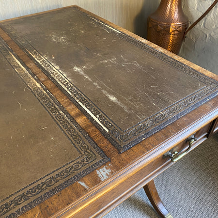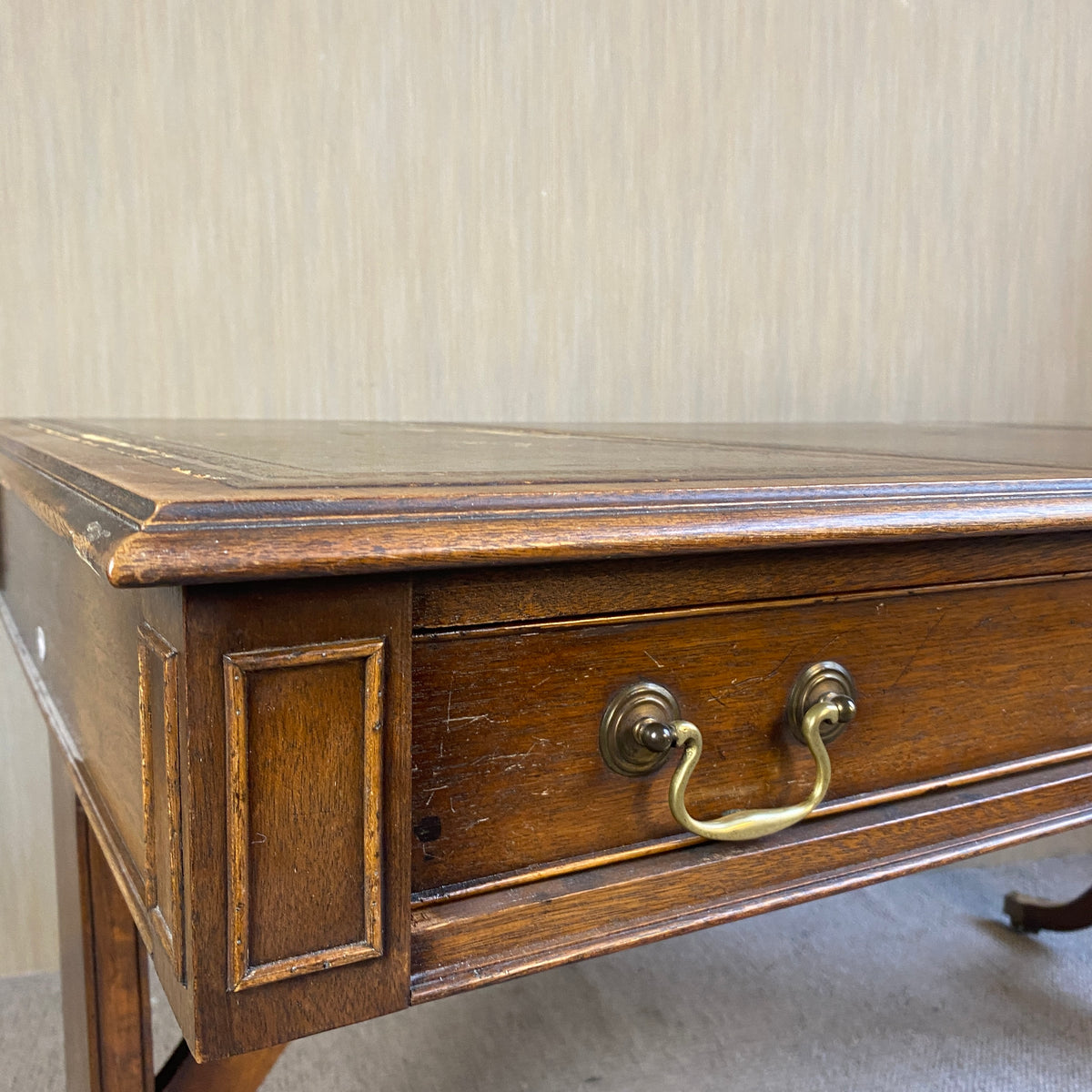 + Mahagonifarbenes Holz. Rechteckige, 2-schübige Zarge mit Ledereinlage (Kratzer, Gebrauchsspuren) und Messinggriffen