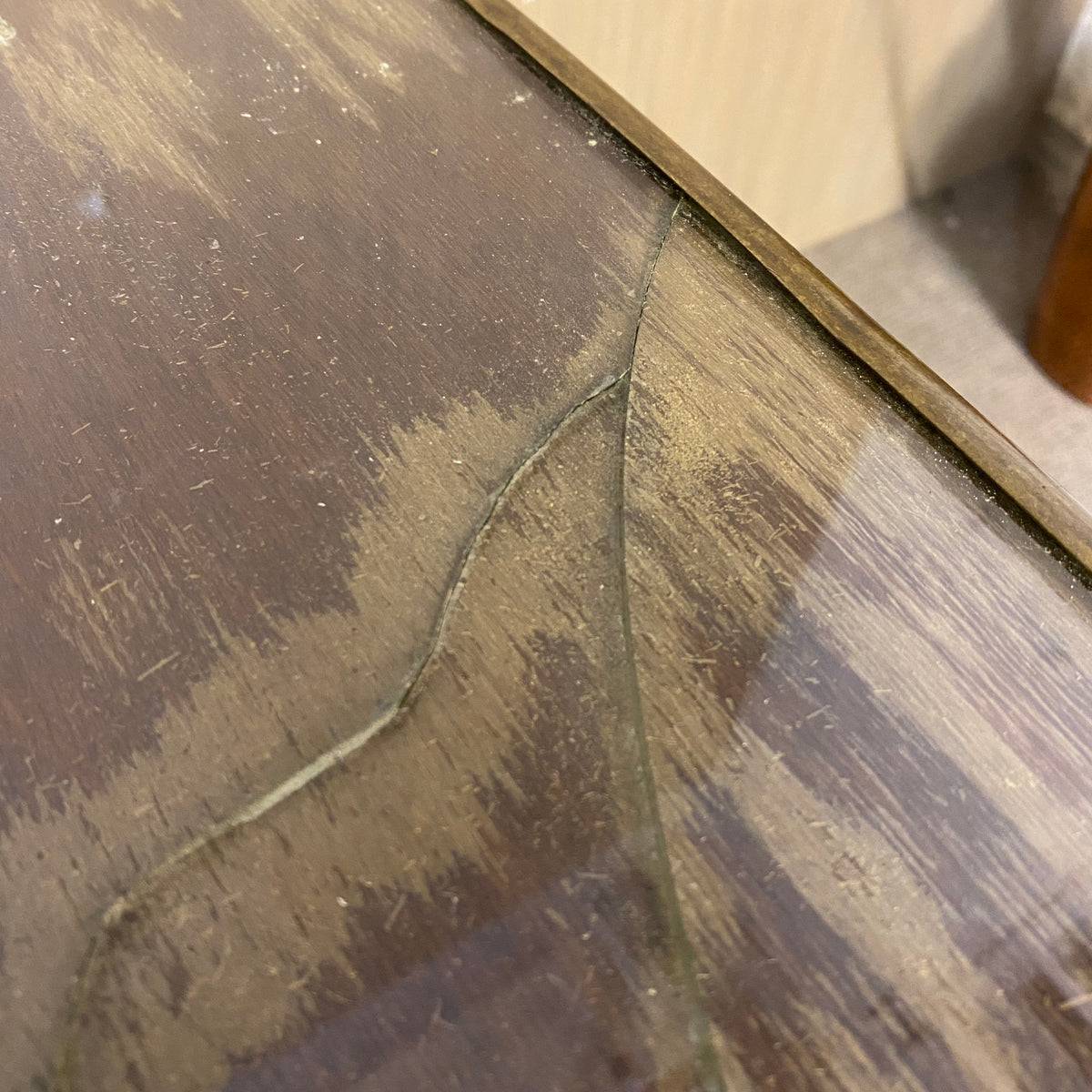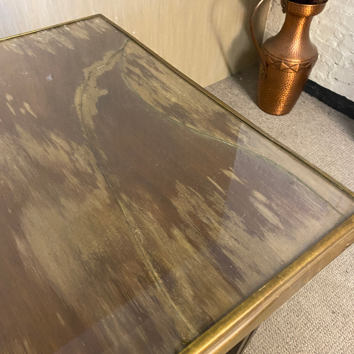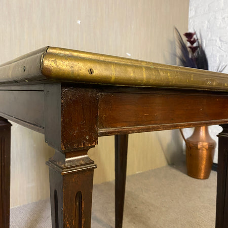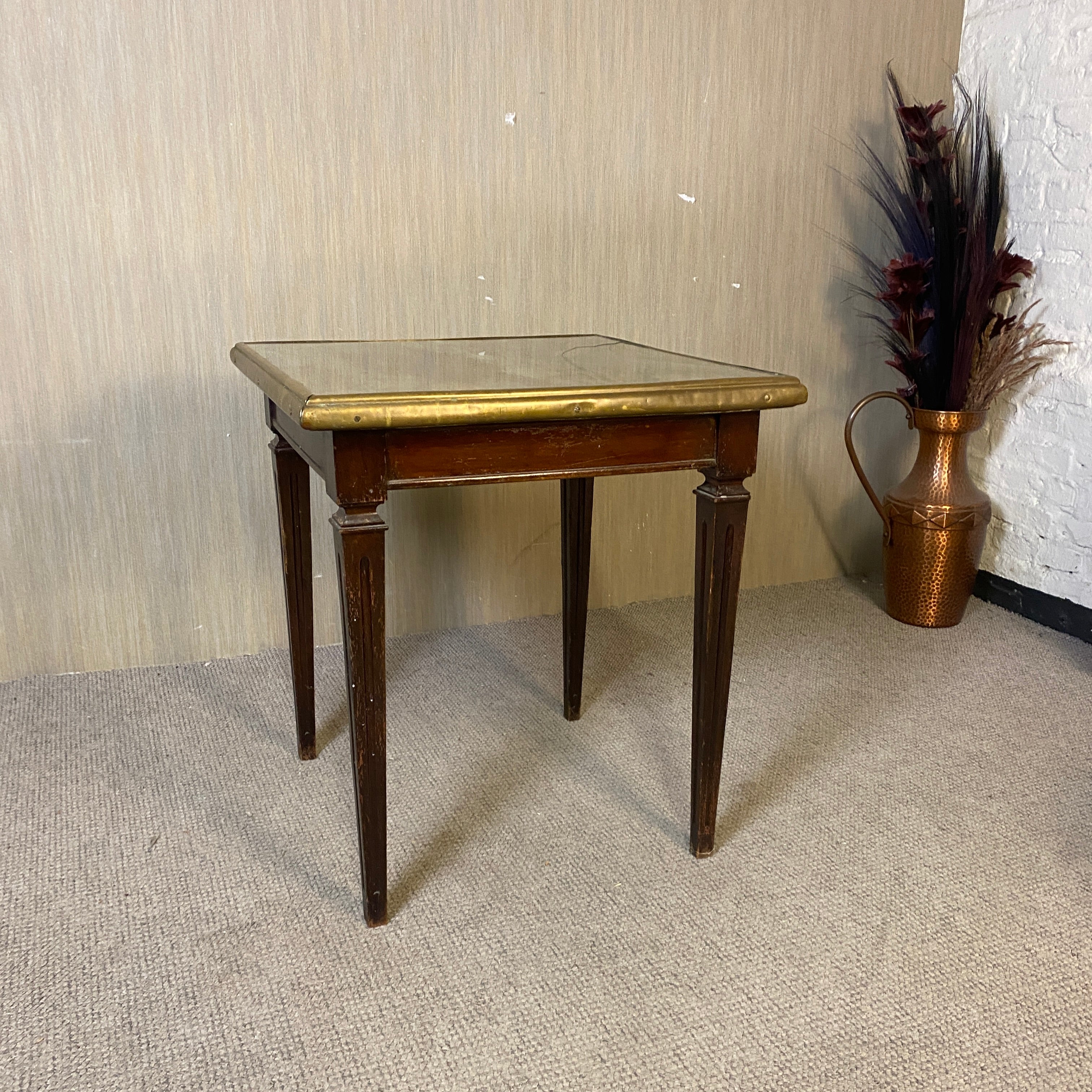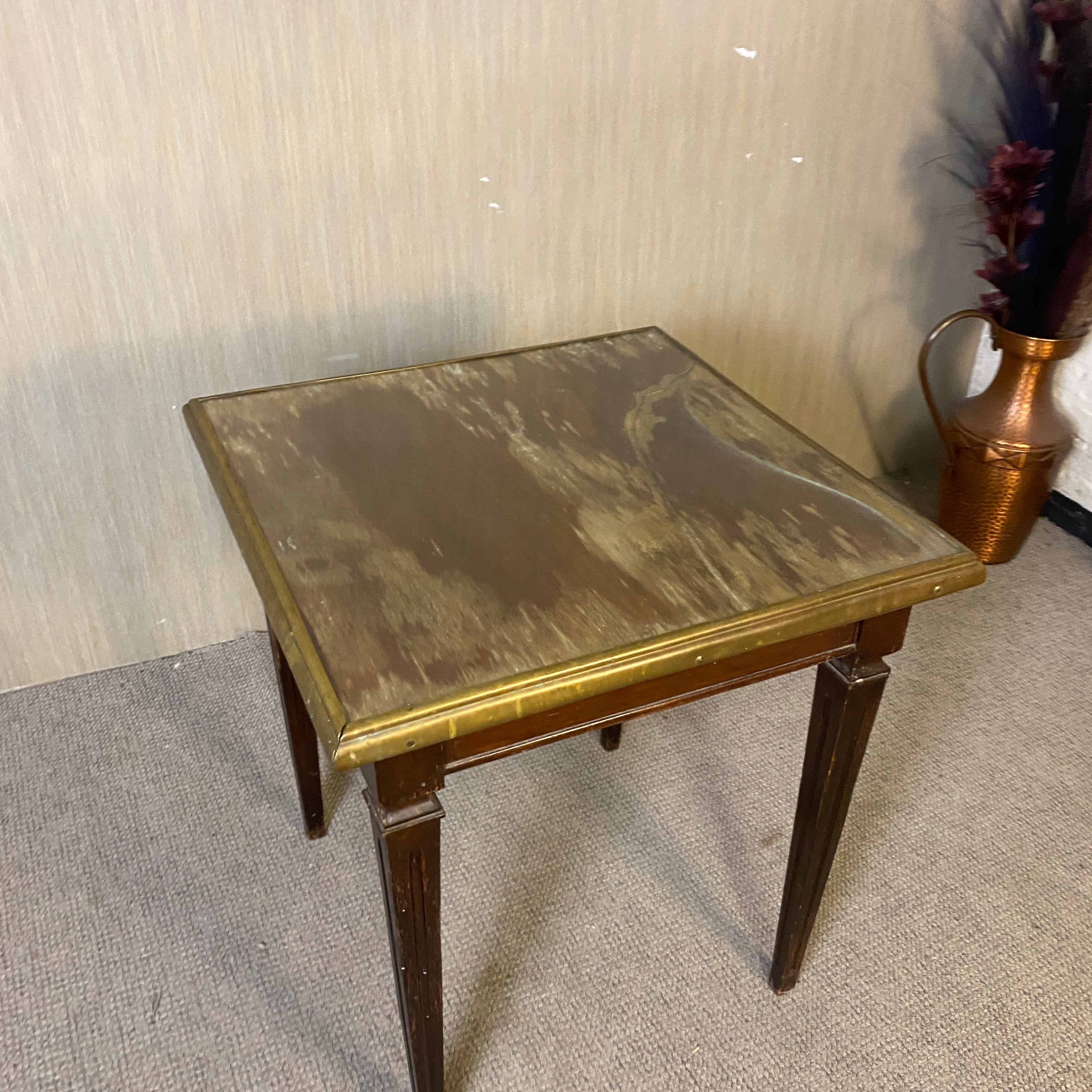 + Nussbaum. Quadratische Platte mit Glas (Feuchtigkeitsschaden), Messingeinfassung. Auf konischen Beinen.