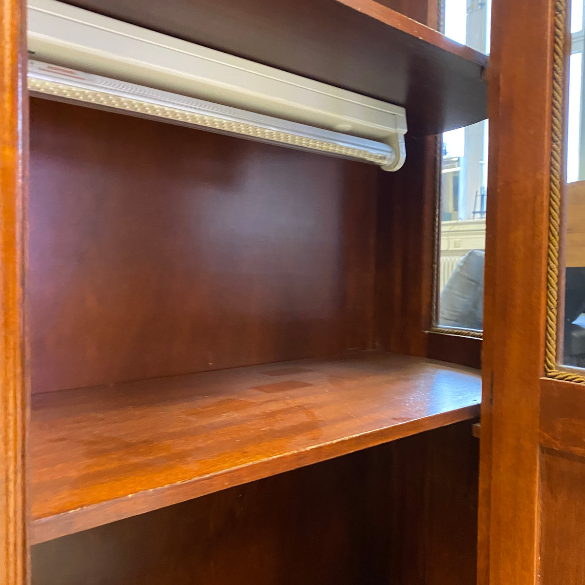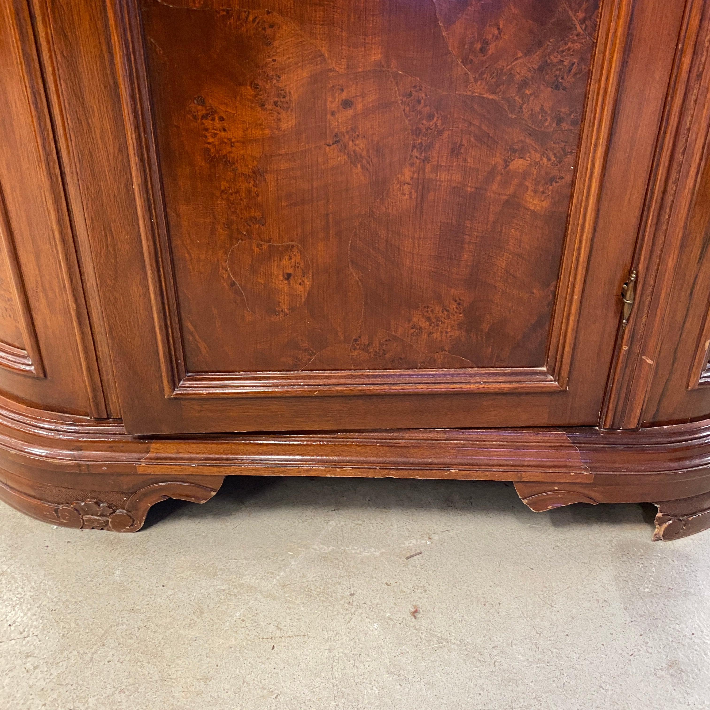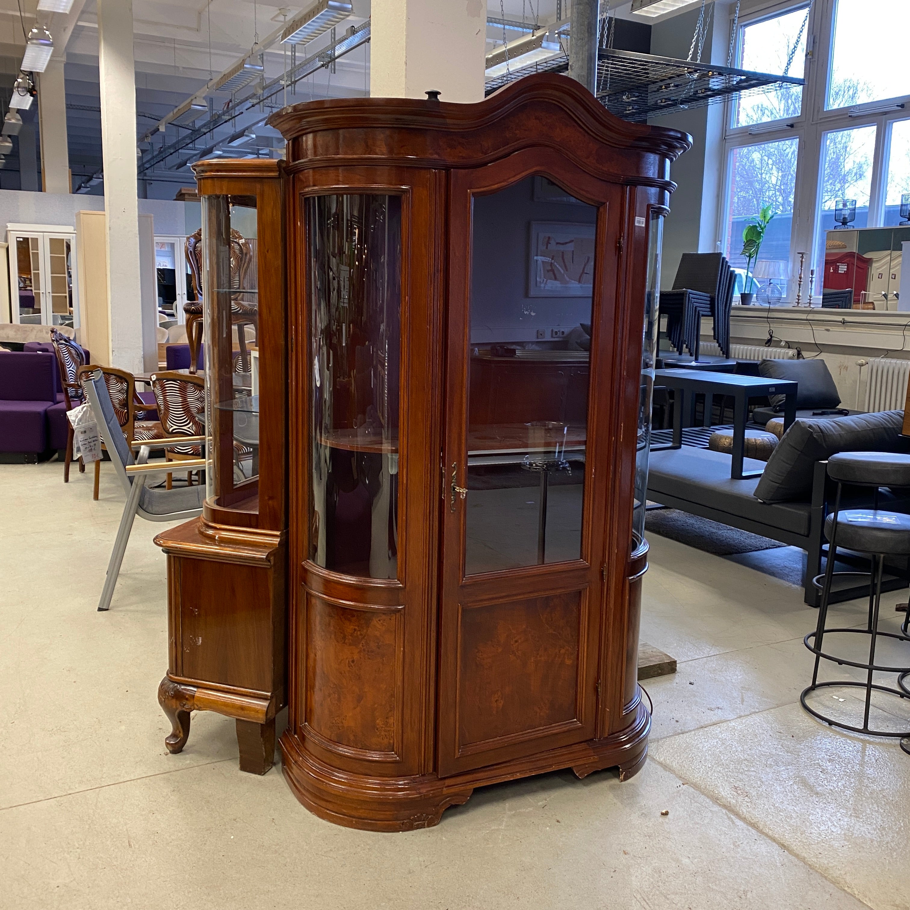 + Antiker Vitrinenschrank im eleganten Barockstil mit geschwungenem Kranz.