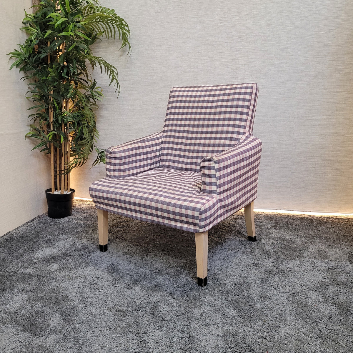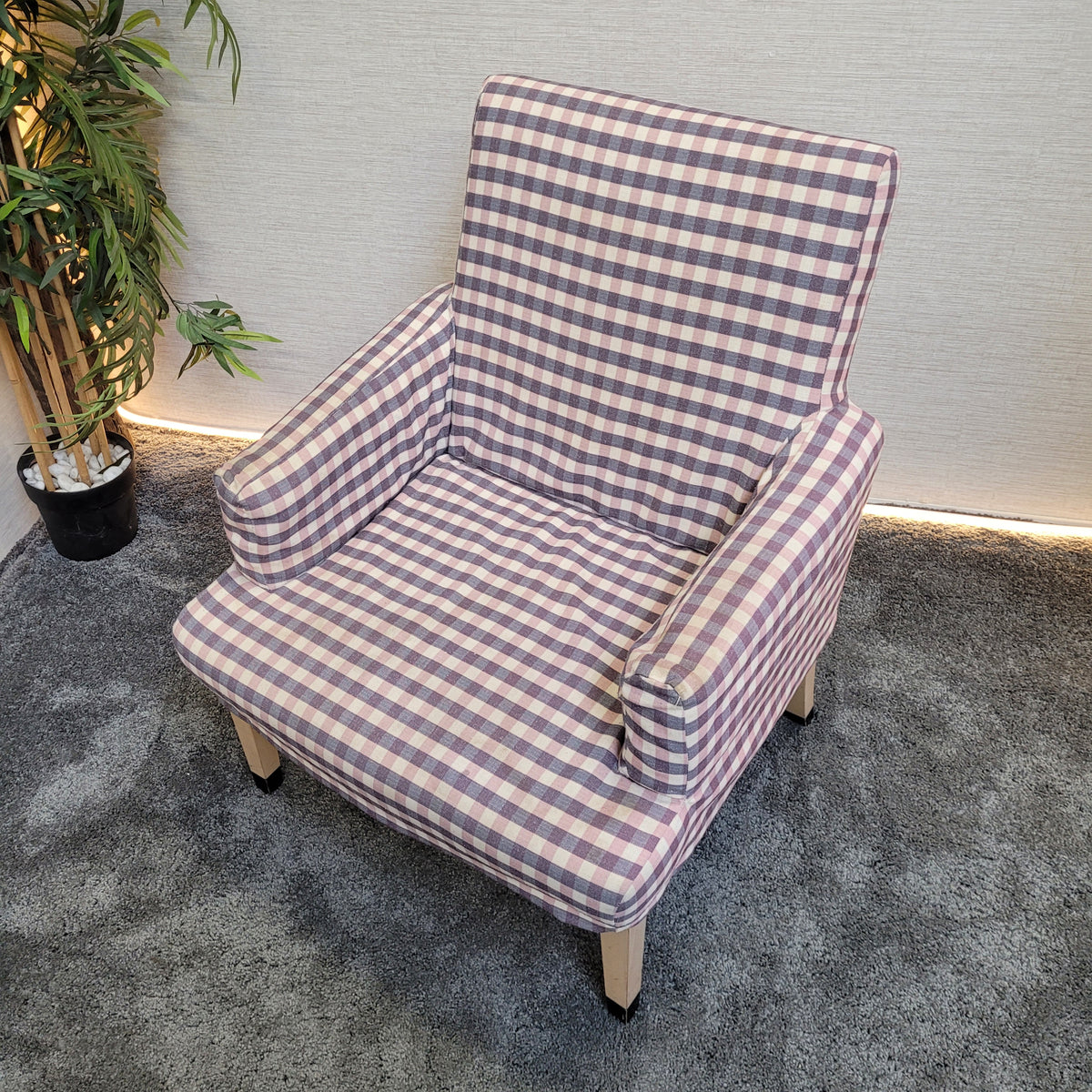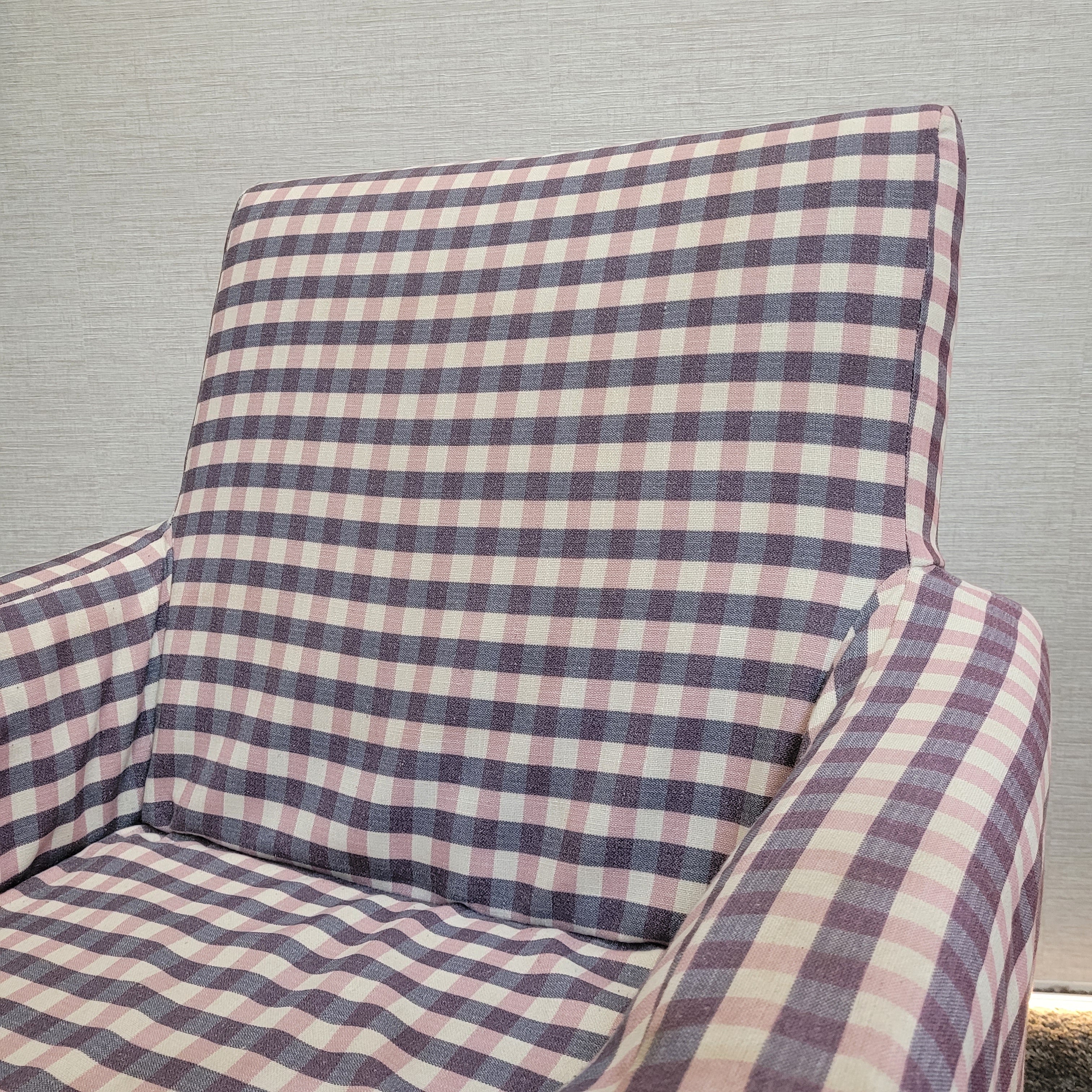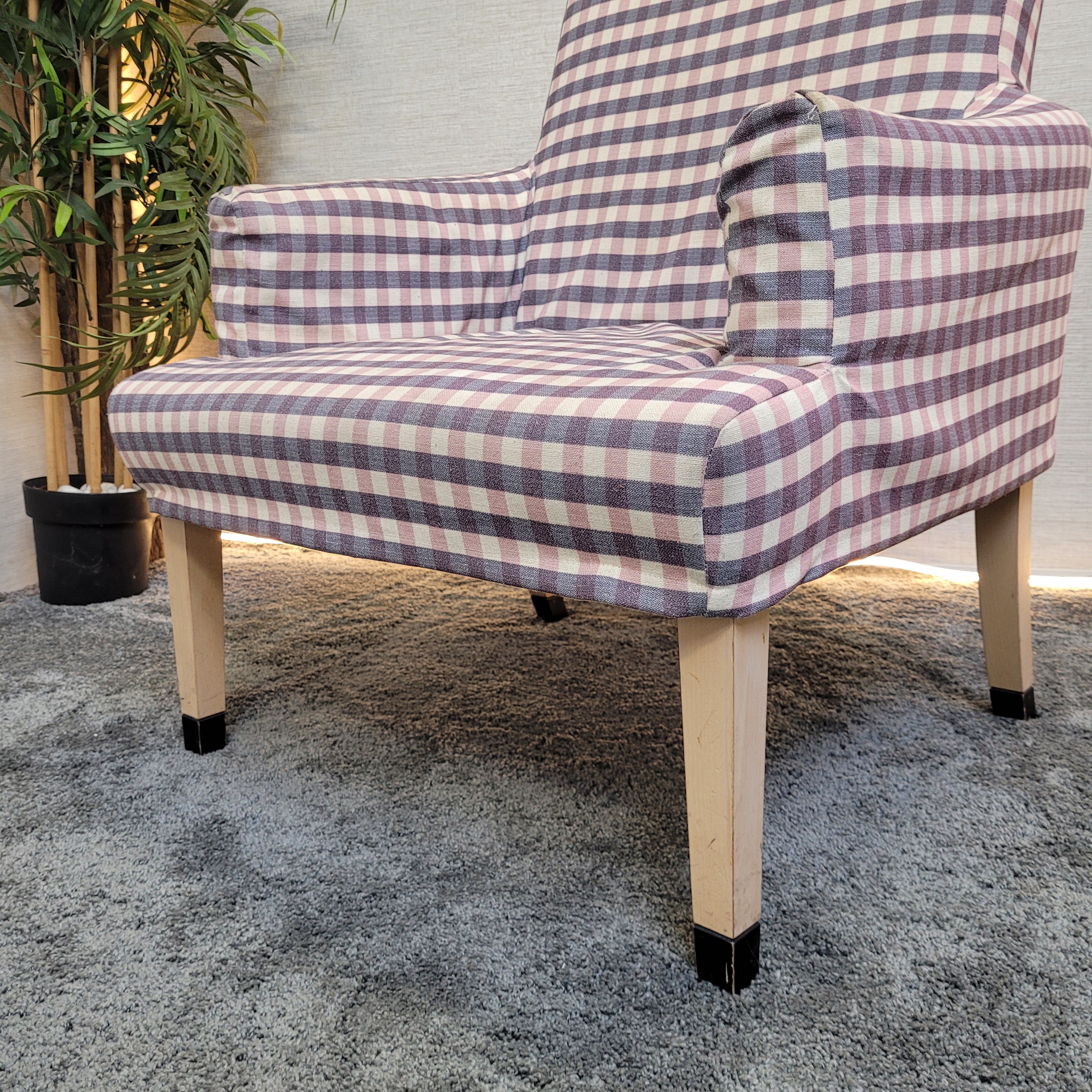 + Stilvoller Retro-Sessel mit auffälligem kariertem Stoffbezug