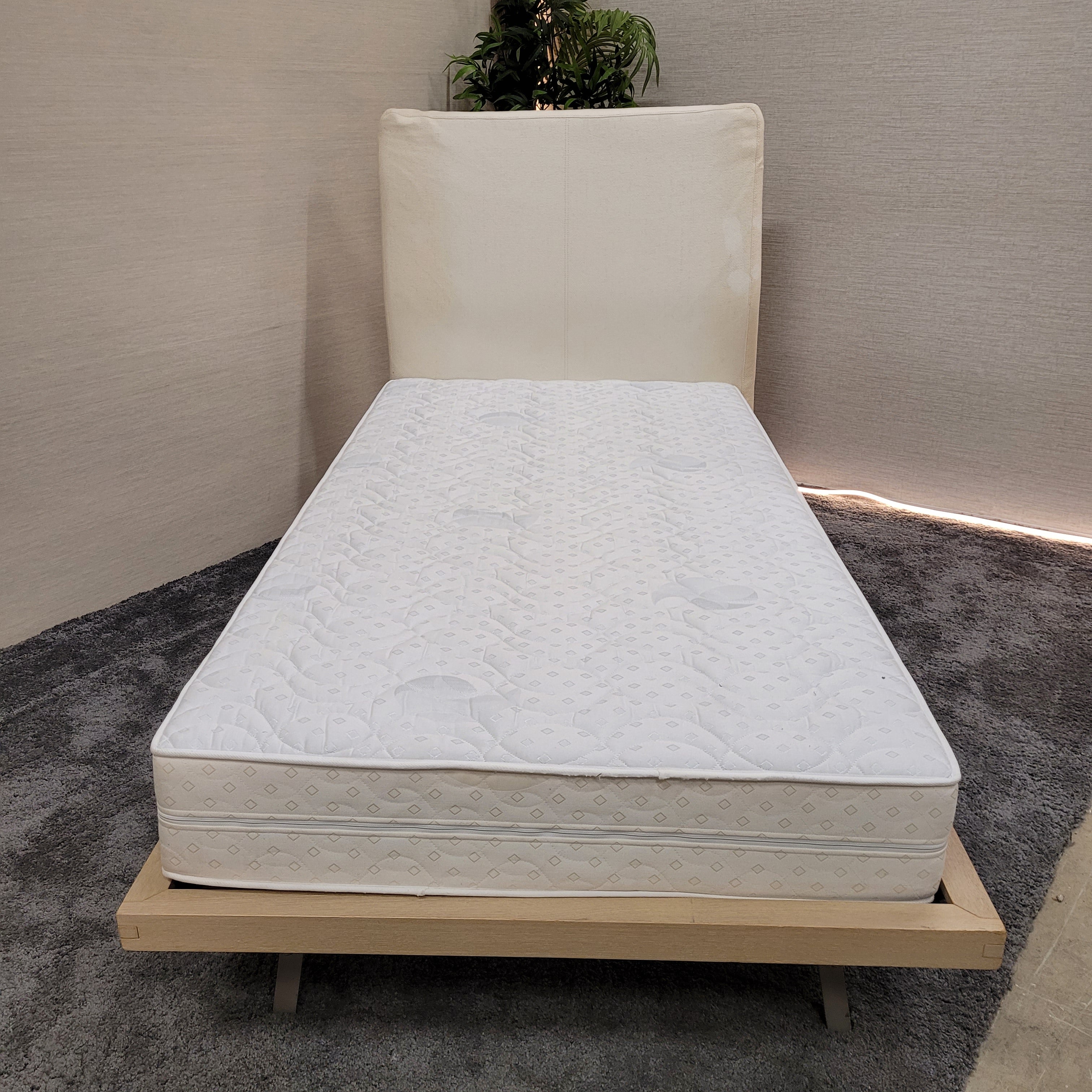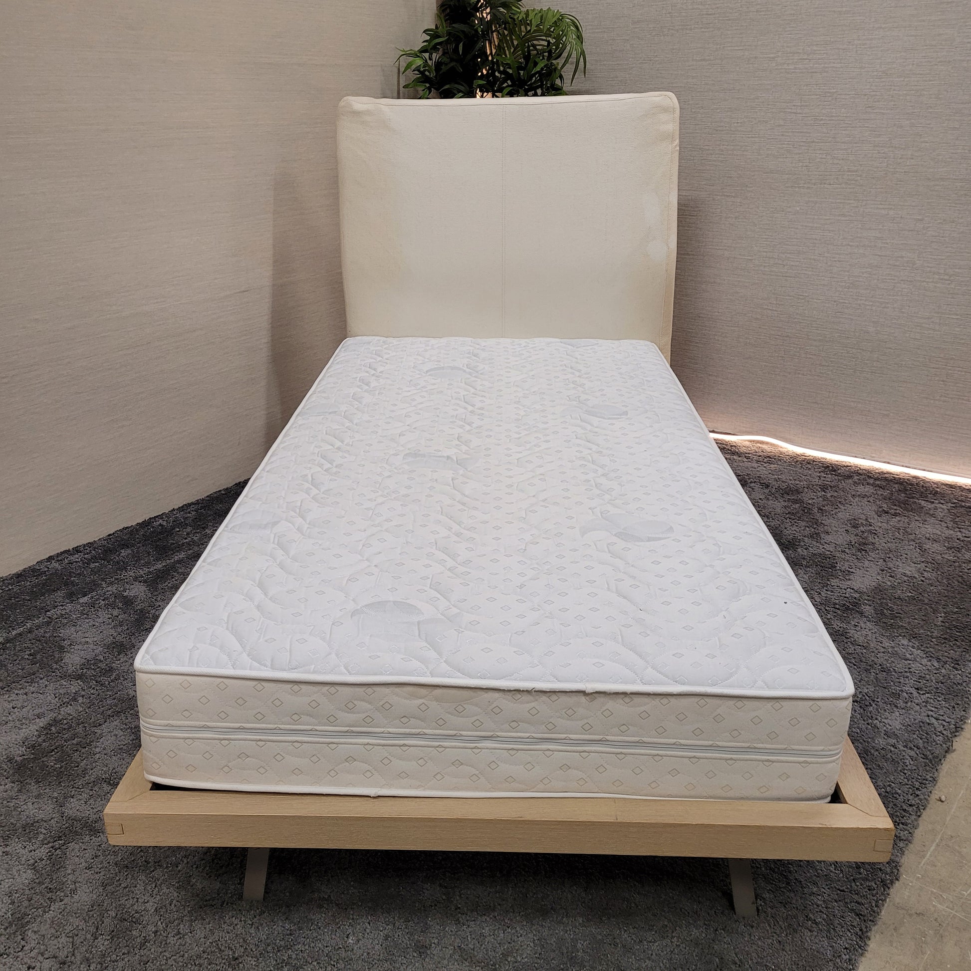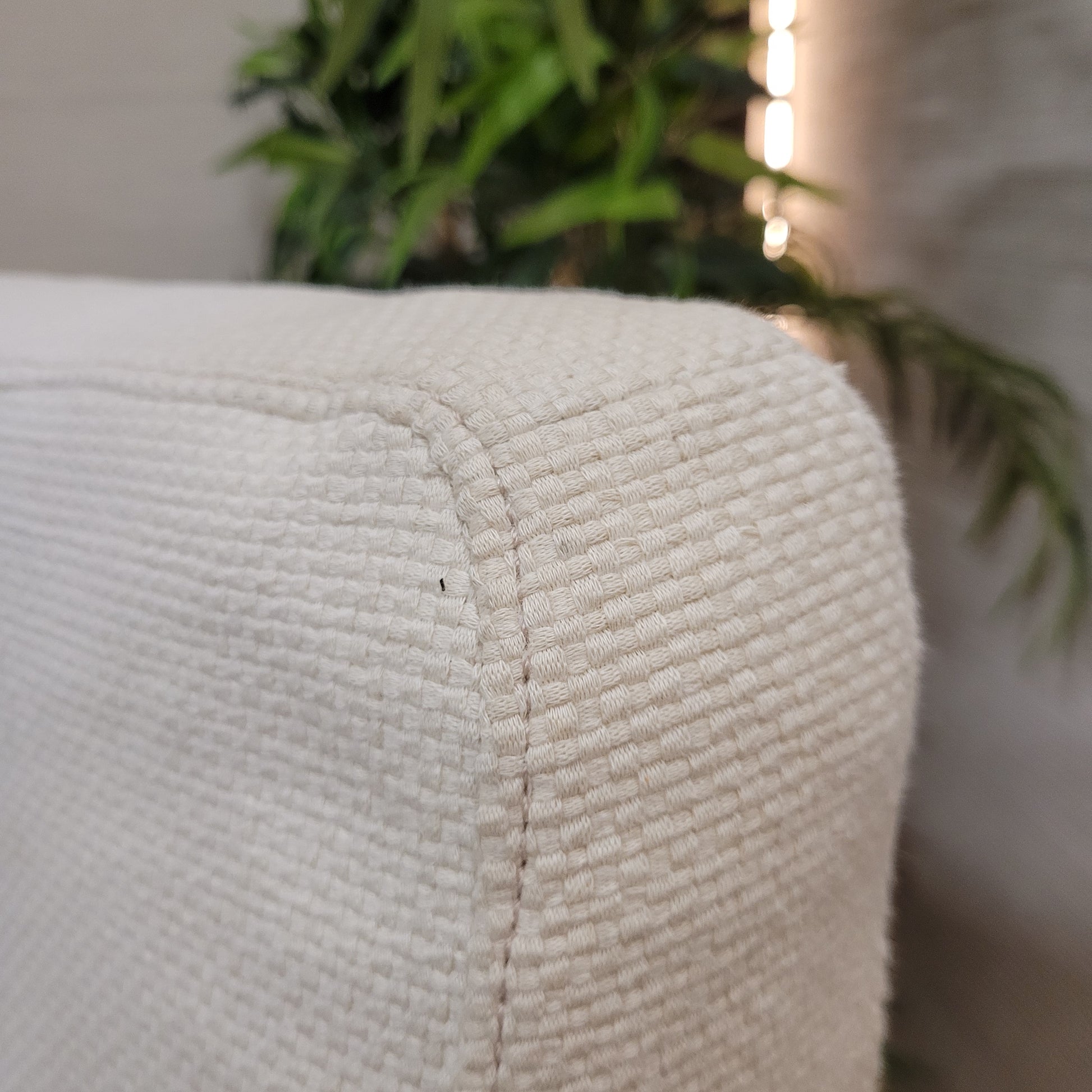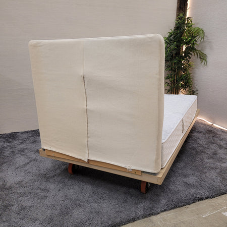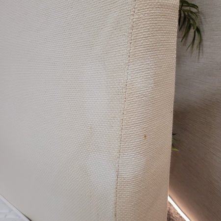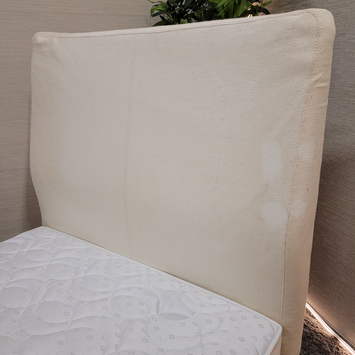 + Gepolstertes Kopfteil in hellem Stoff – bequem zum Anlehnen
