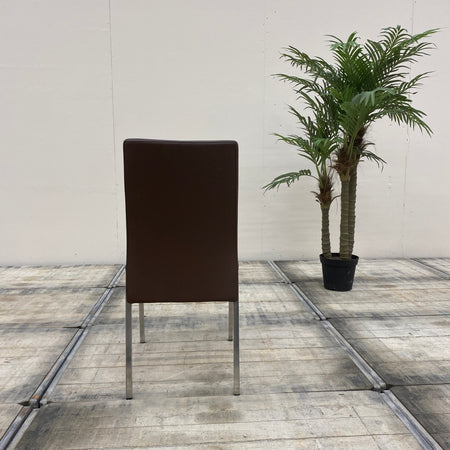 • Eleganter Polsterstuhl in zeitlosem Dunkelbraun mit einem stabilen Metallgestell. Die glatte Kunstleder-Oberfläche ist besonders pflegeleicht und lässt sich hygienisch abwischen, was ihn ideal für den täglichen Einsatz macht.