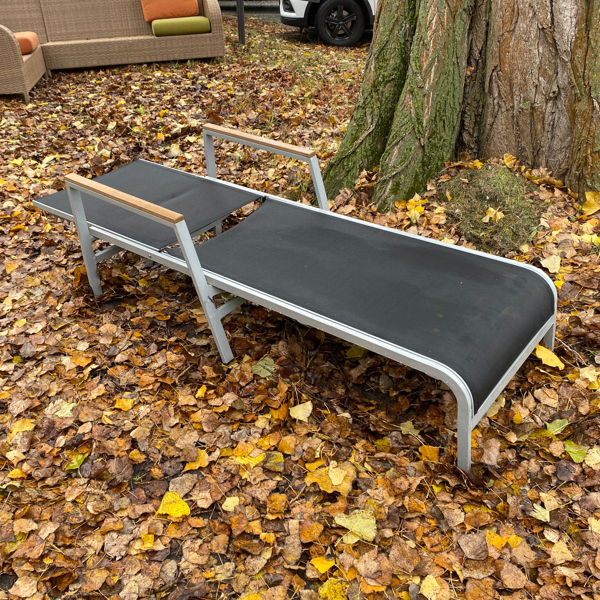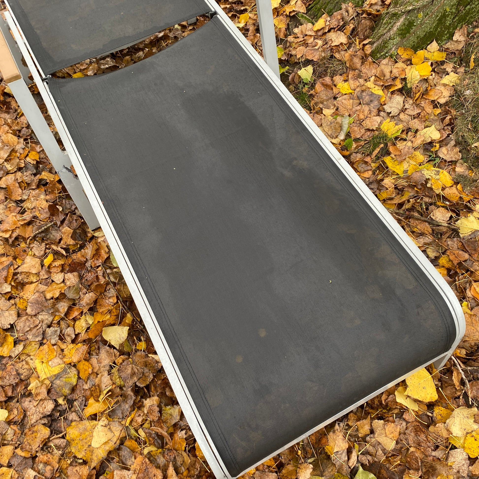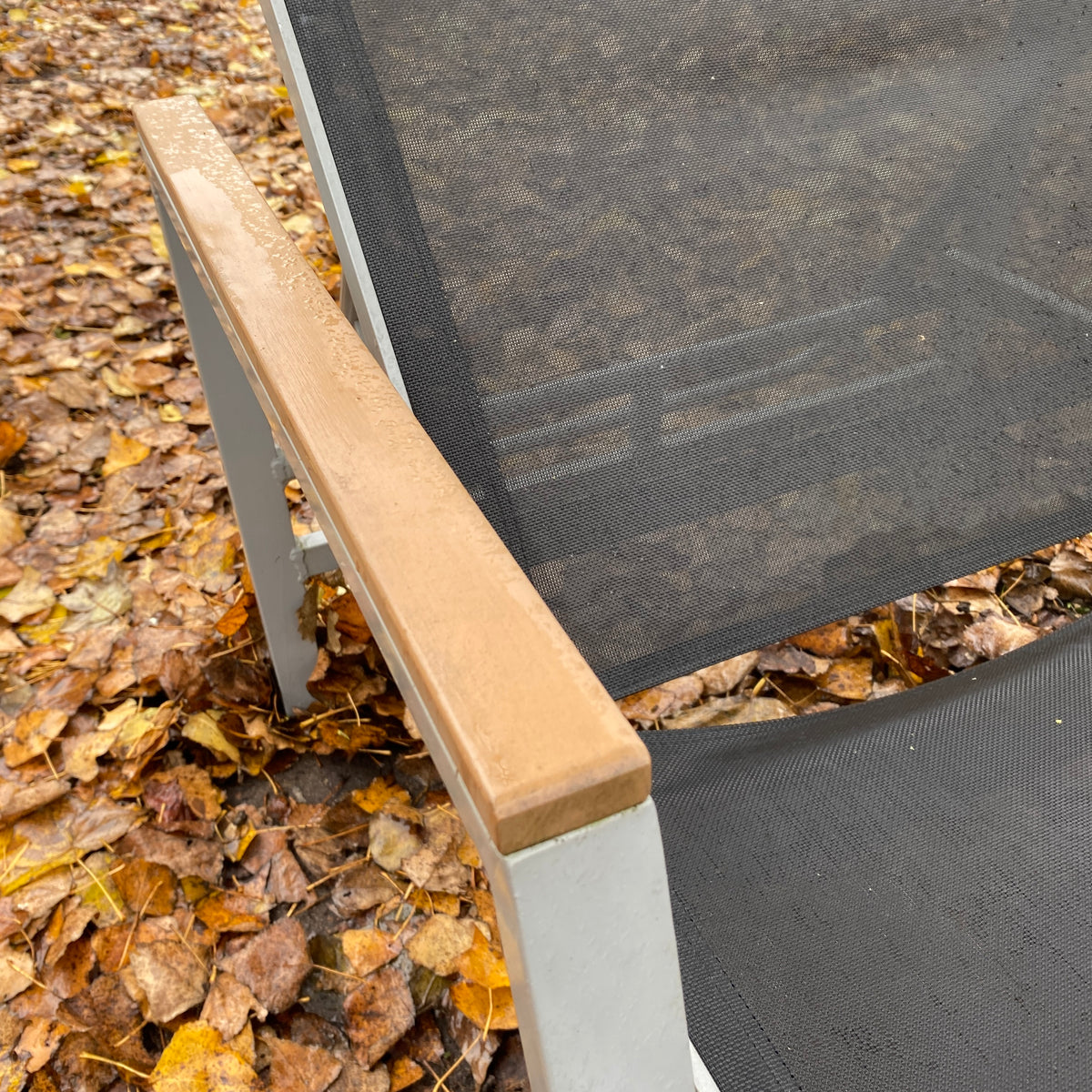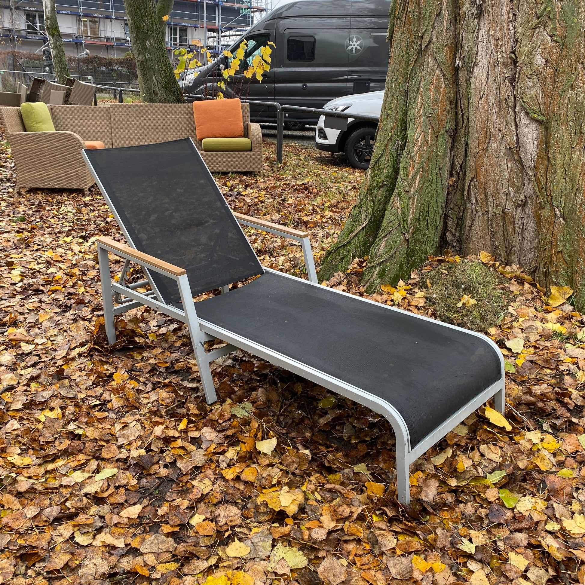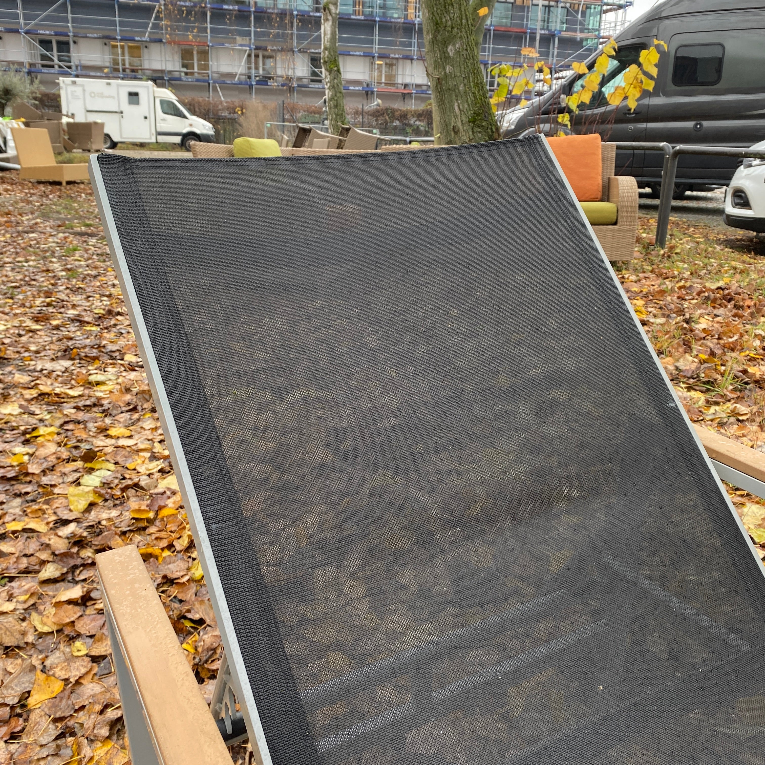 + Gebrauchsspuren sichtbar (leichte Flecken auf dem Textilene, Holz leicht verwittert), aber voll funktionsfähig