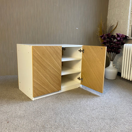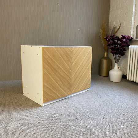 + Zeitloses Design: Kombination aus weißem Korpus und warmer Holzoptik-Fronte im Fischgräten-Look