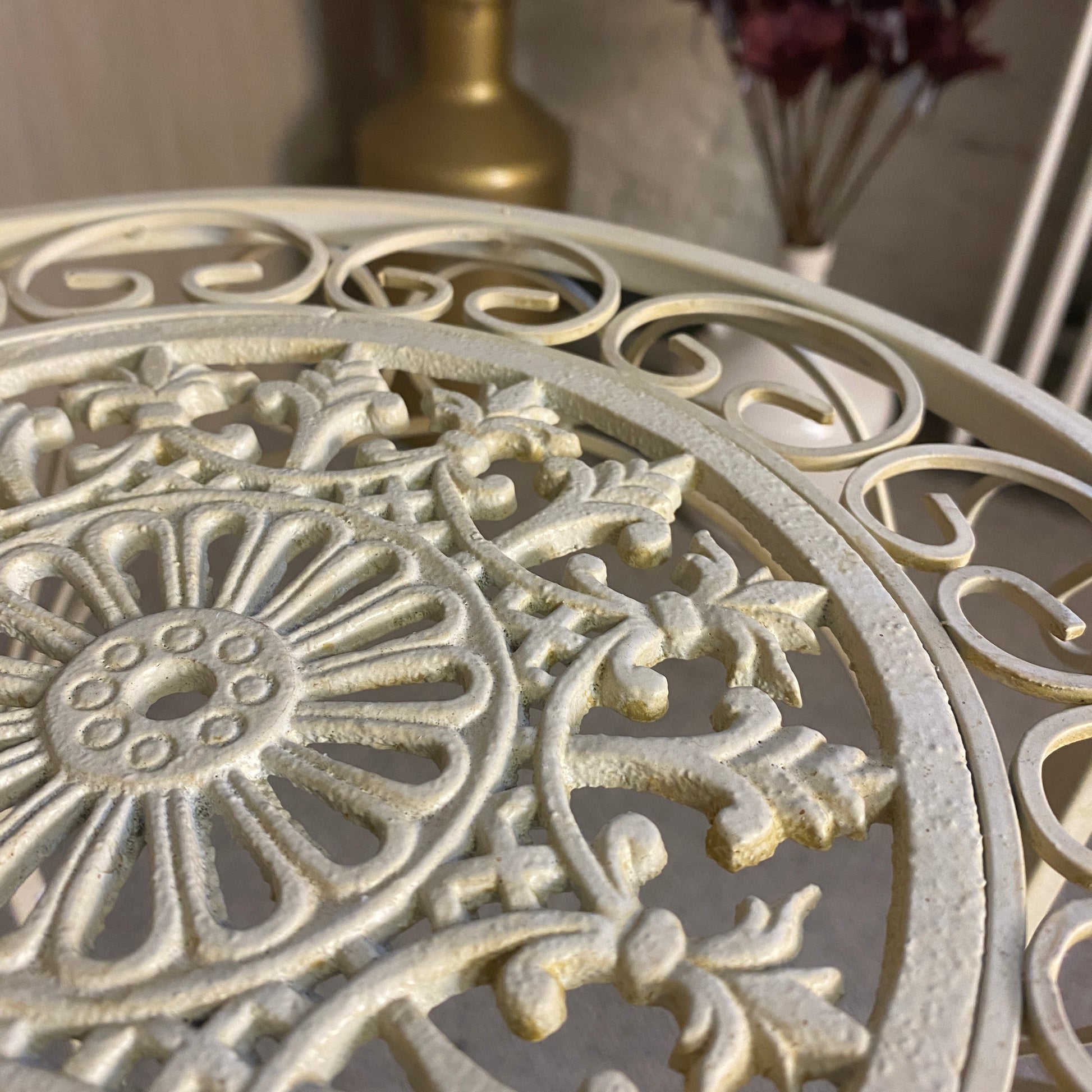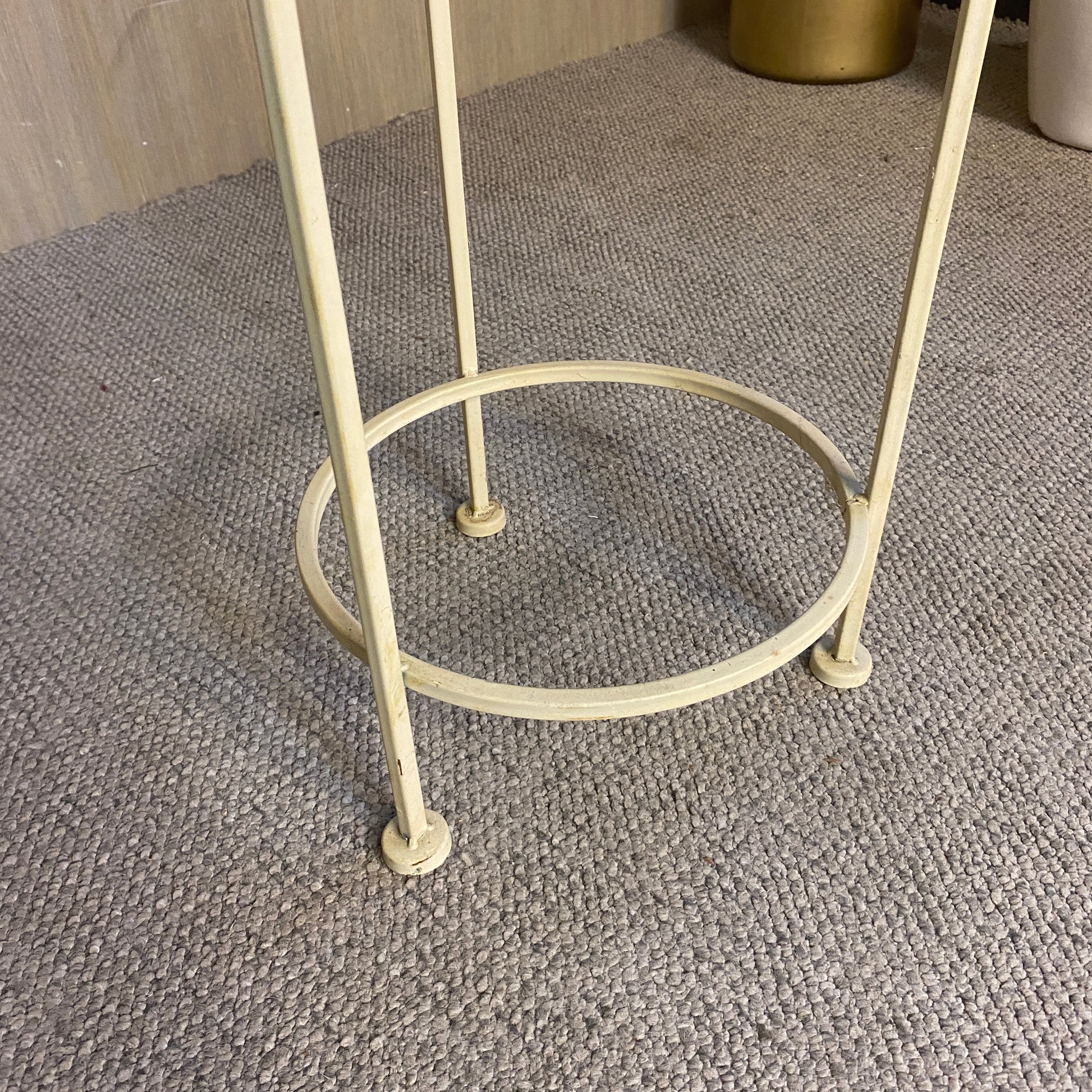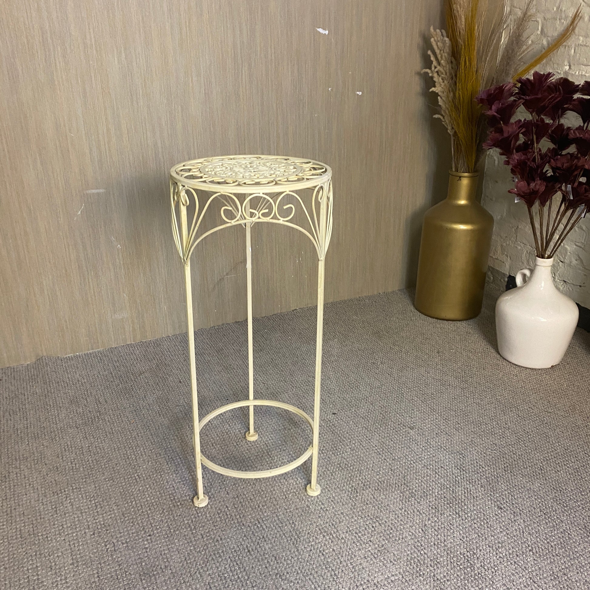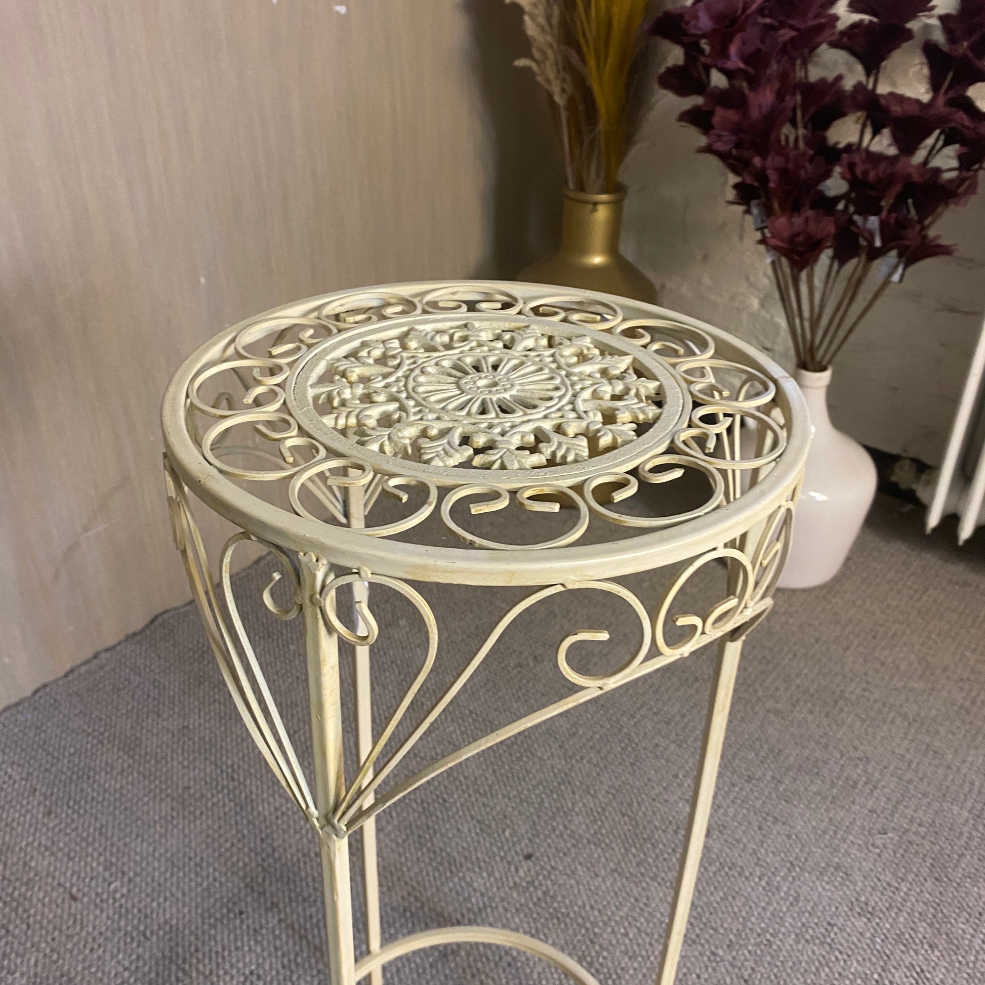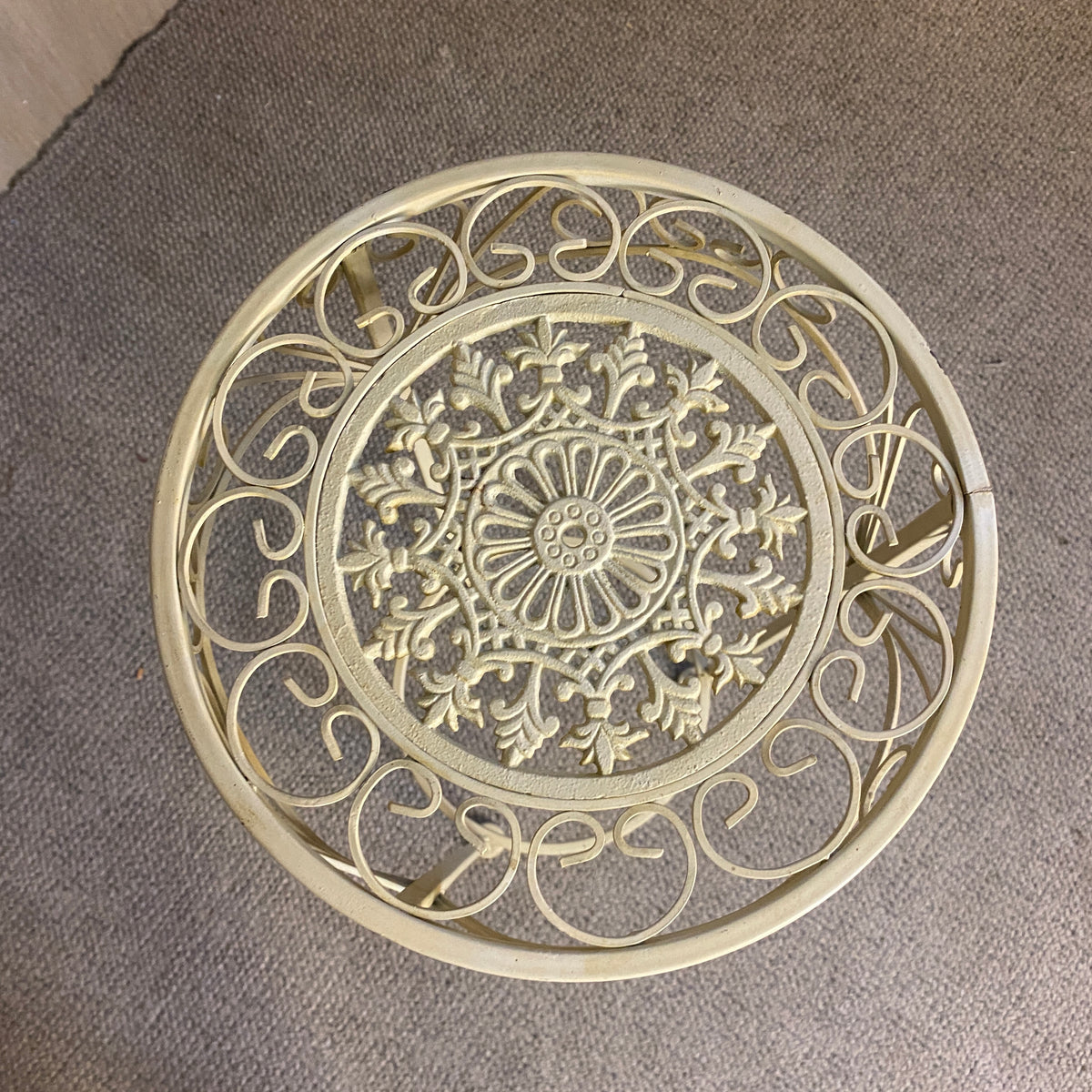 + Filigraner Pflanzentisch aus Metall im cremefarbenen Vintage-Look.