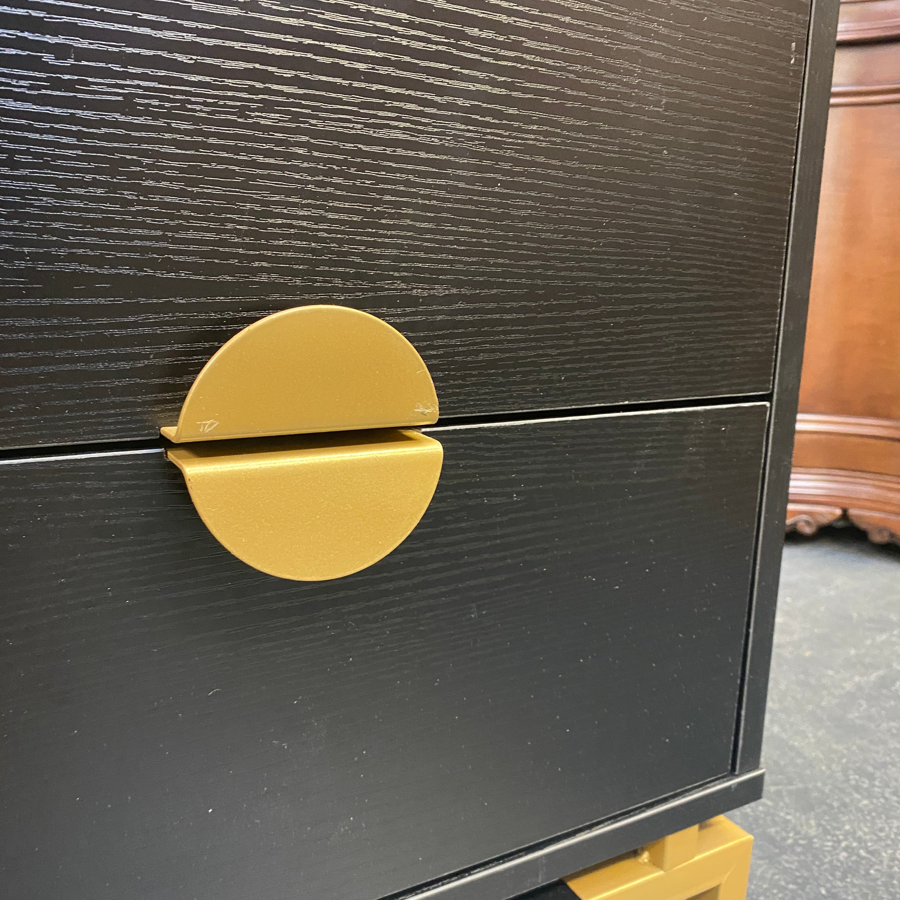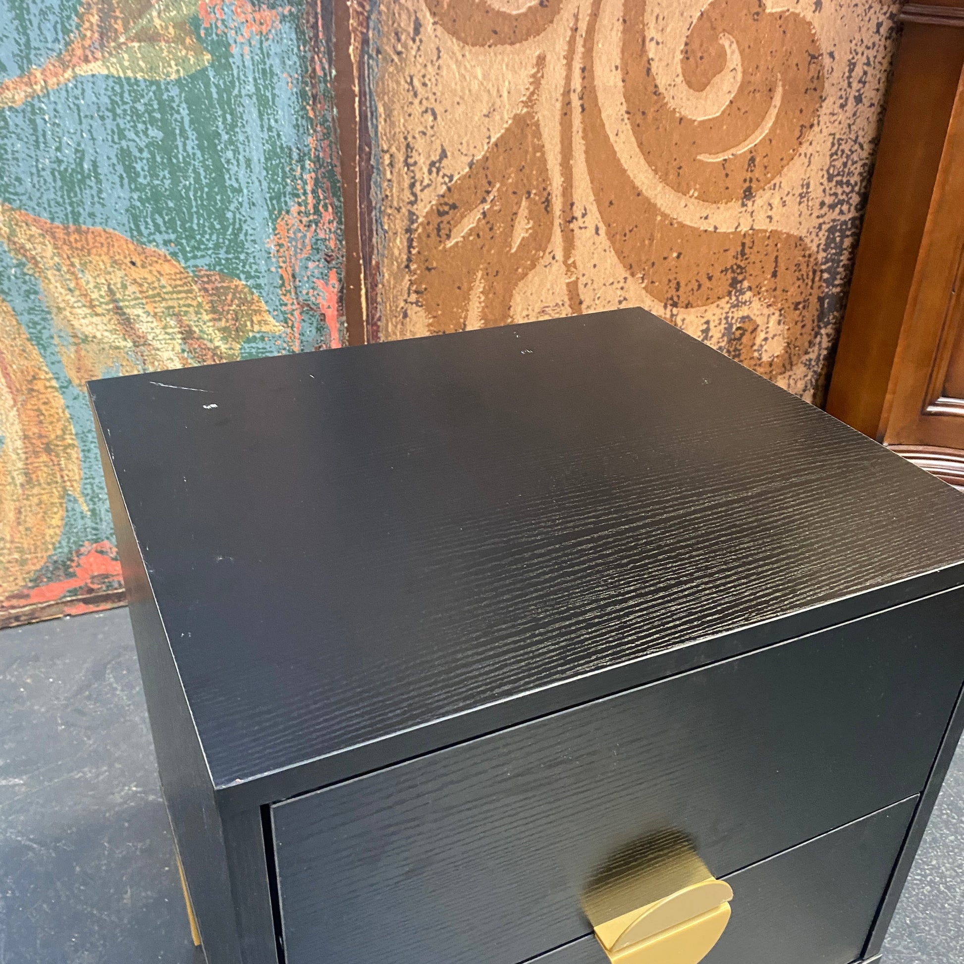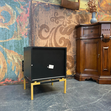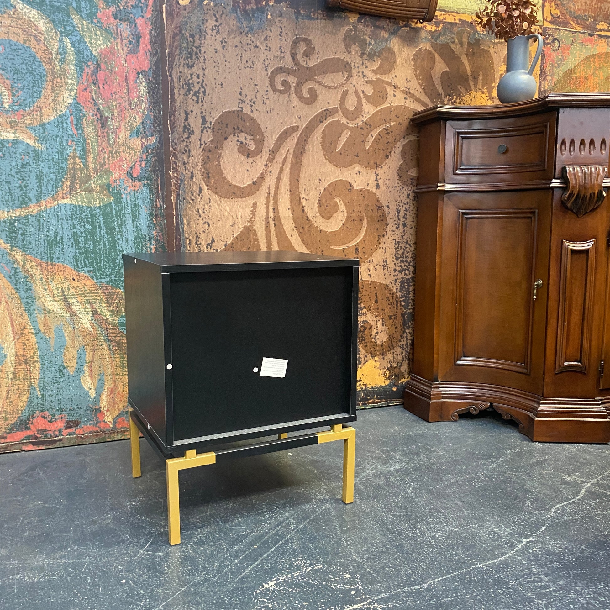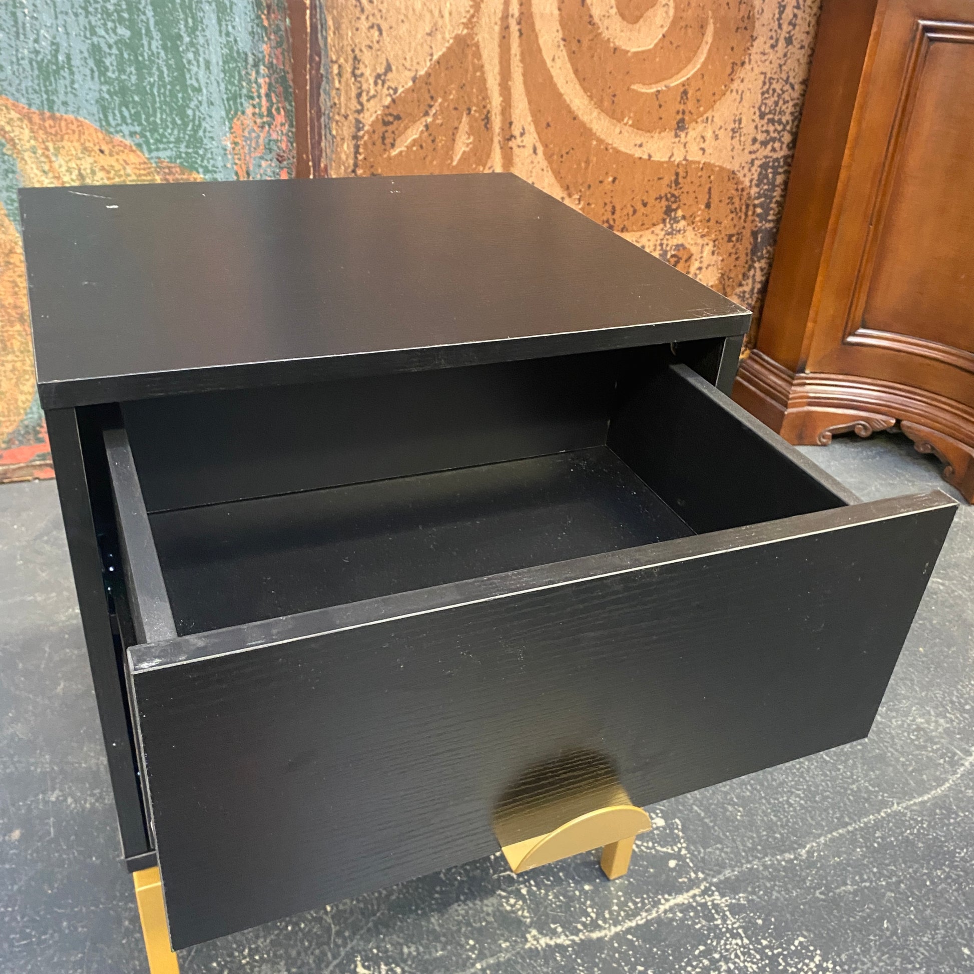 + Moderner schwarzer Nachttisch mit goldfarbenen Griff- und Fußdetails.