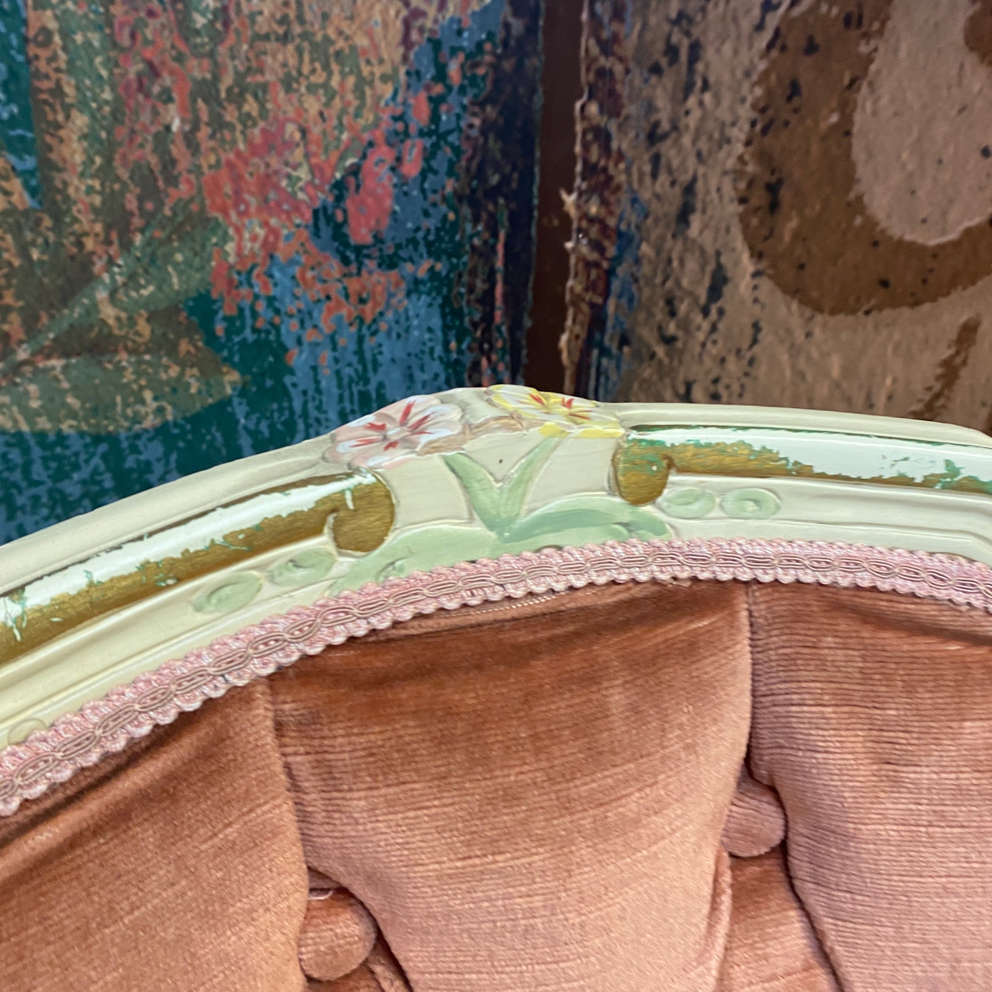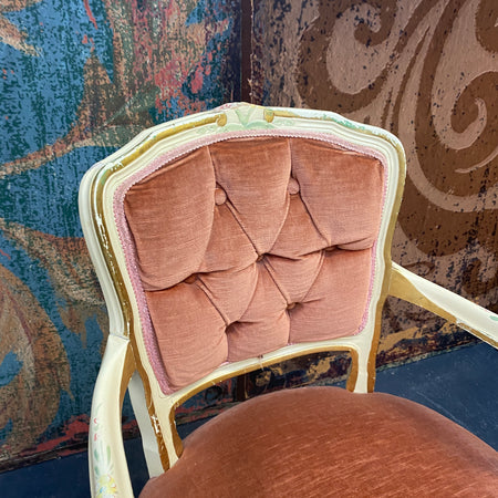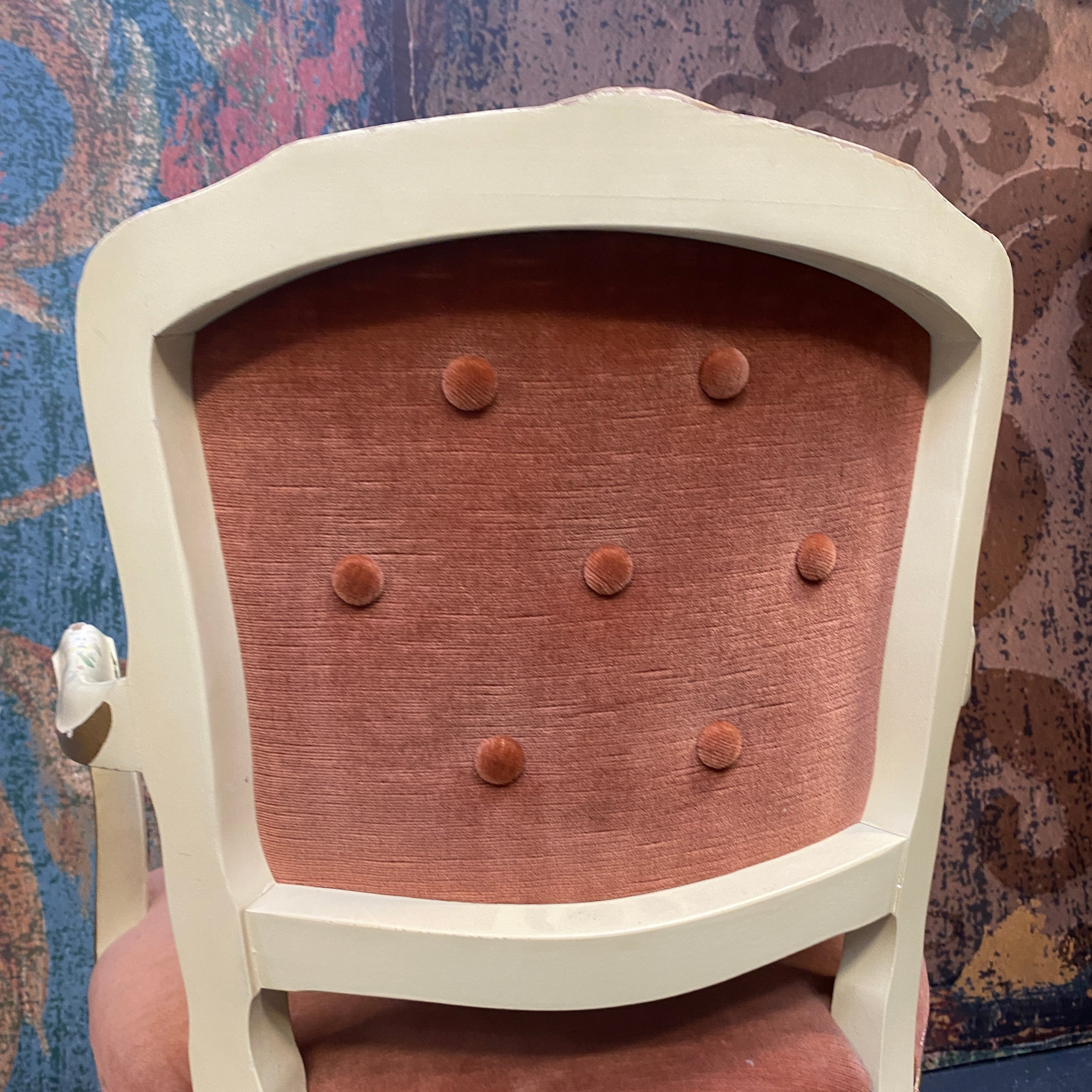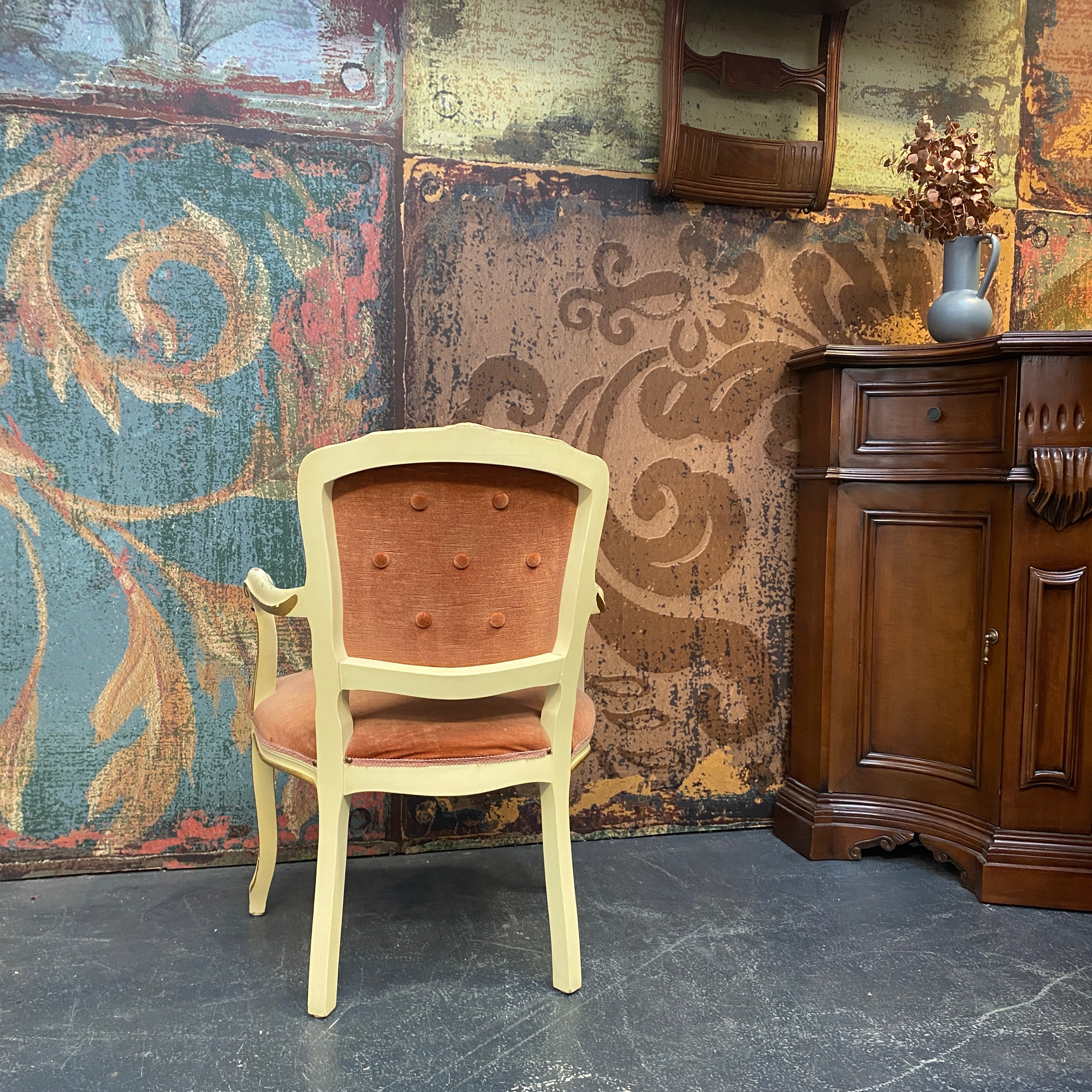 + Weiches Samtpolster in warmem Rostorange, dekorativ mit Knopfheftung verziert.