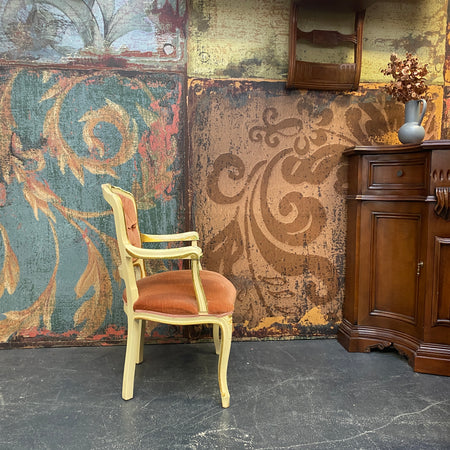 + Eleganter Armlehnstuhl im Louis-XVI-Stil mit leicht geschwungenem Holzrahmen.