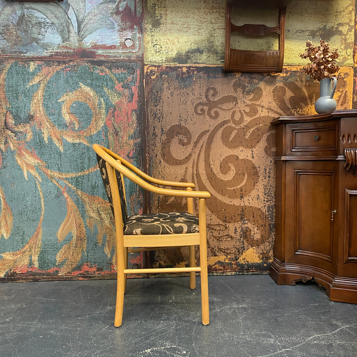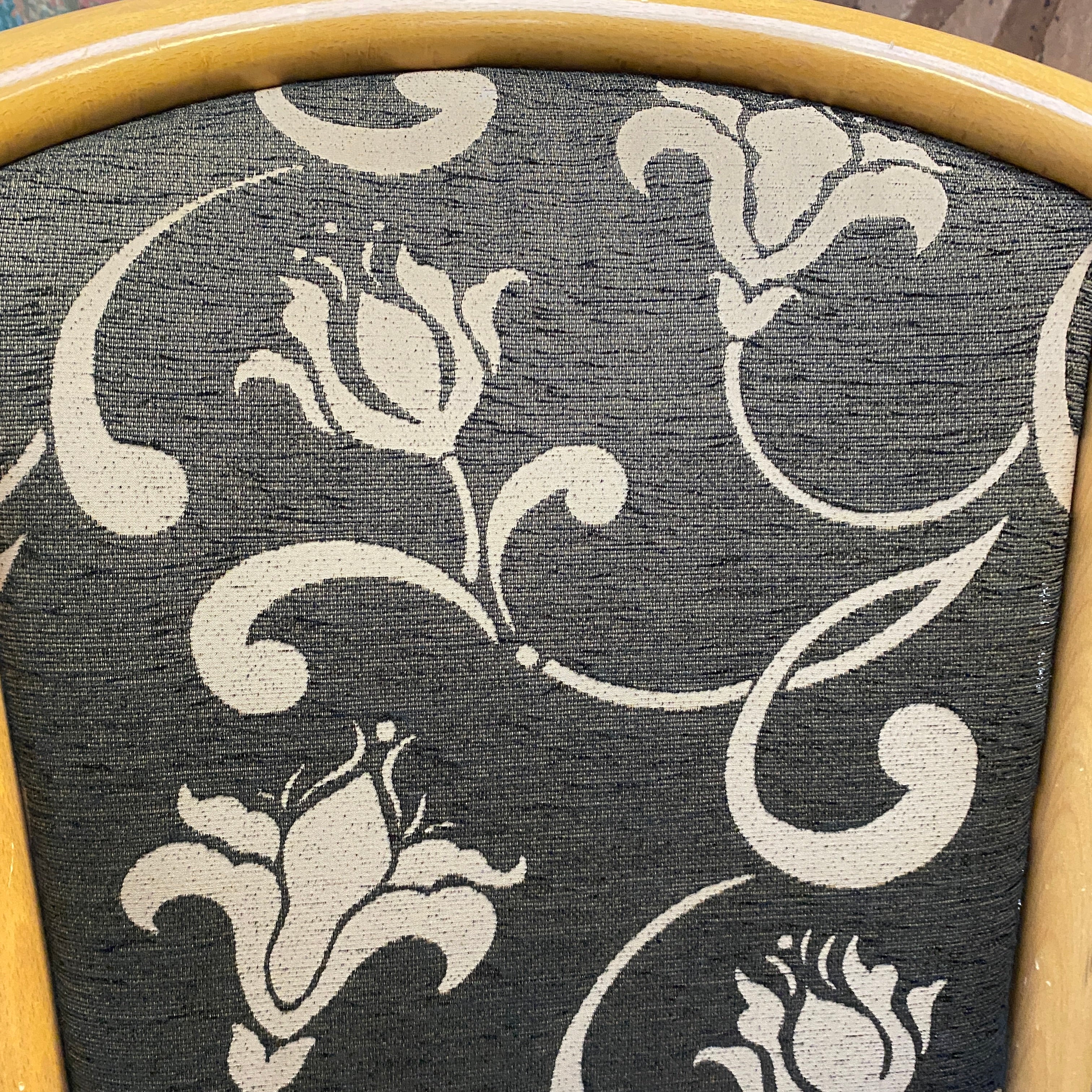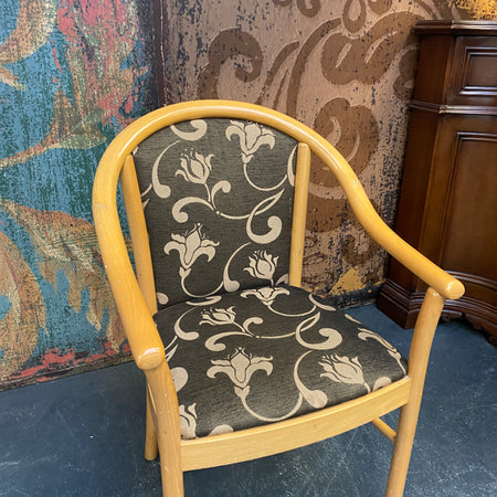 + Schöner Armlehnstuhl mit hellem Holzrahmen und klassischem Vintage-Design.