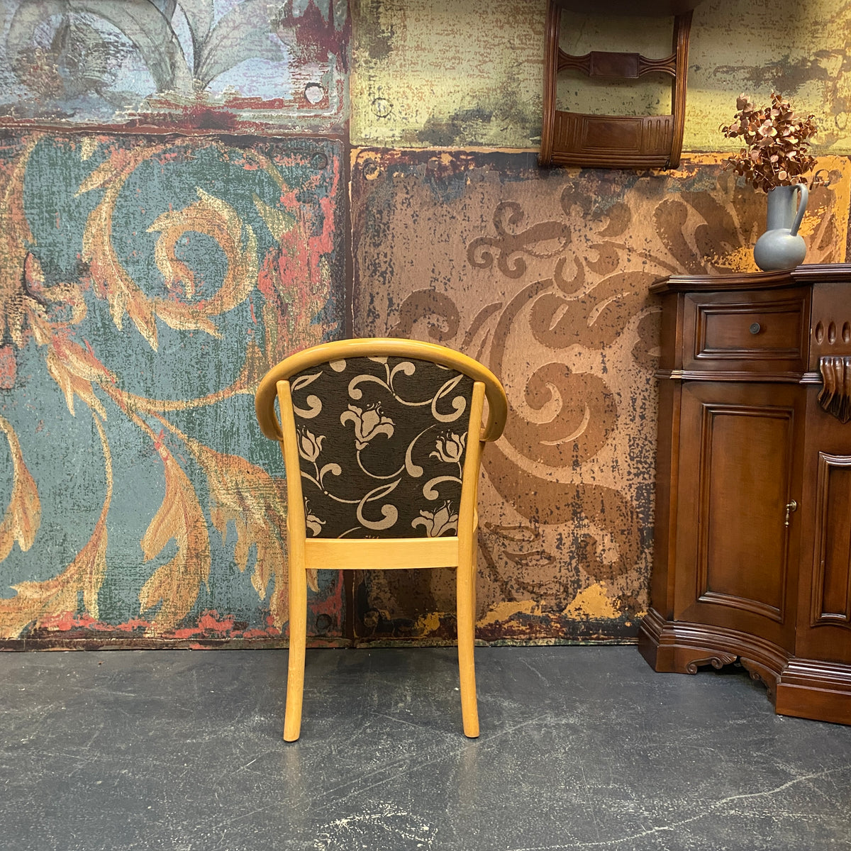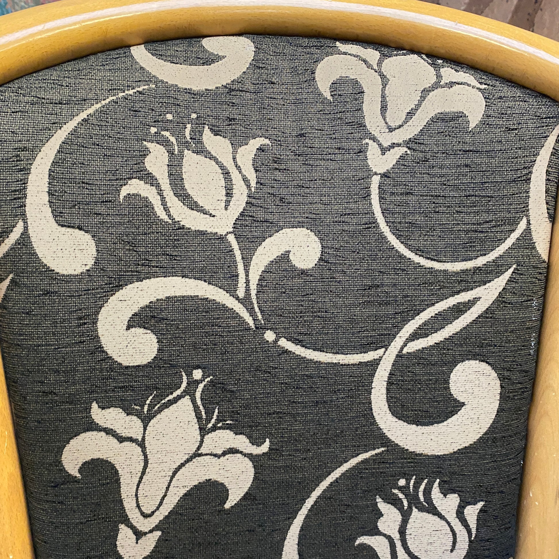 + Dunkles Sitz- und Rückenpolster mit floralem Muster – dekorativ und bequem.