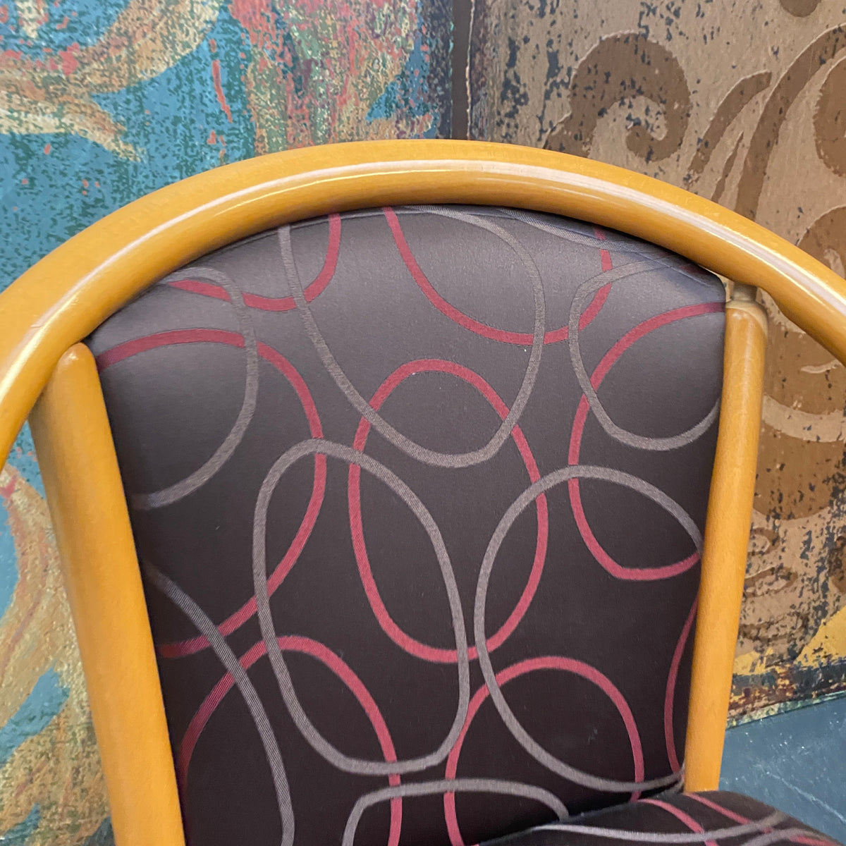 + Sitz- und Rückenpolster in dunkelbraunem Ton mit modernem Kreismuster.