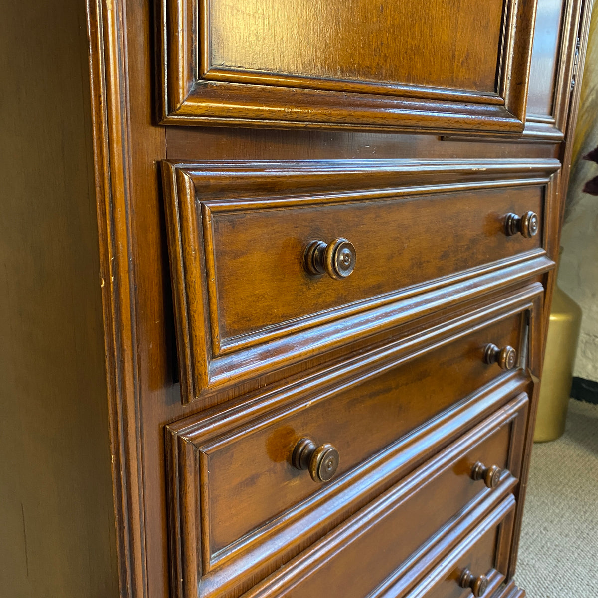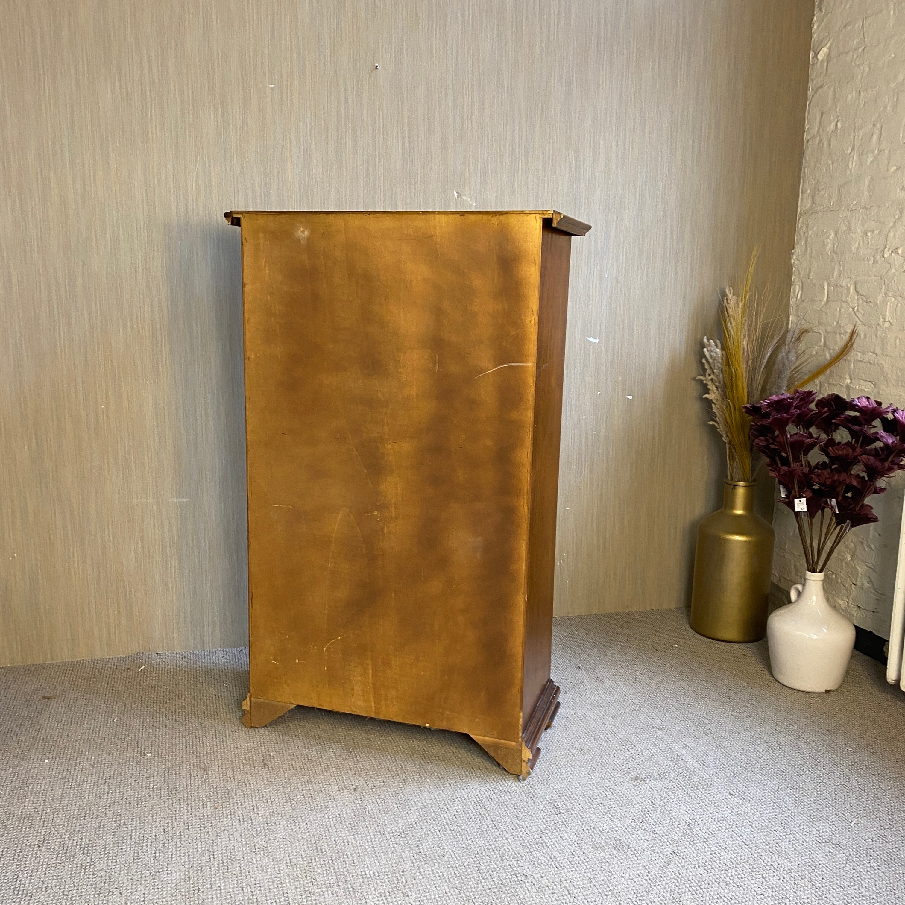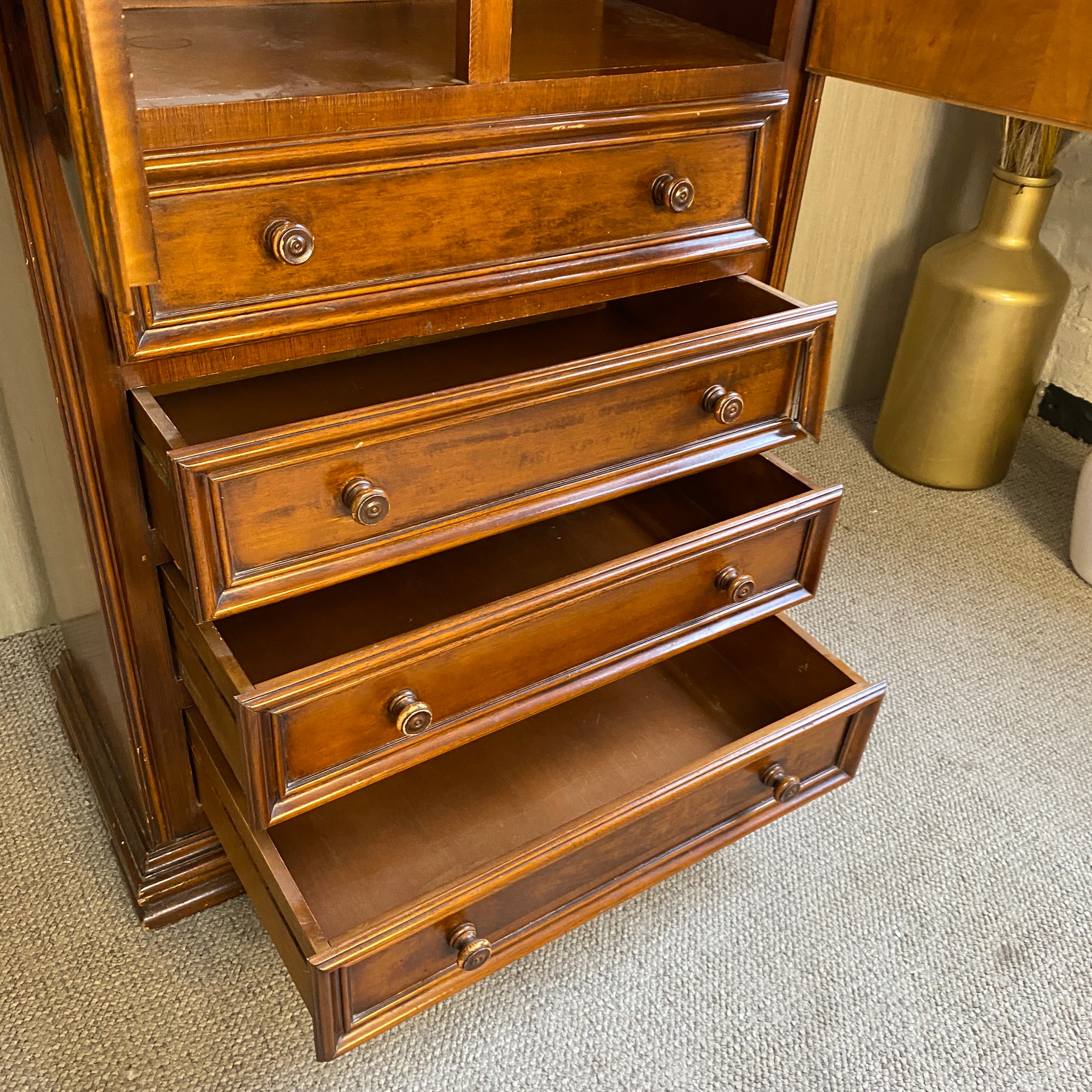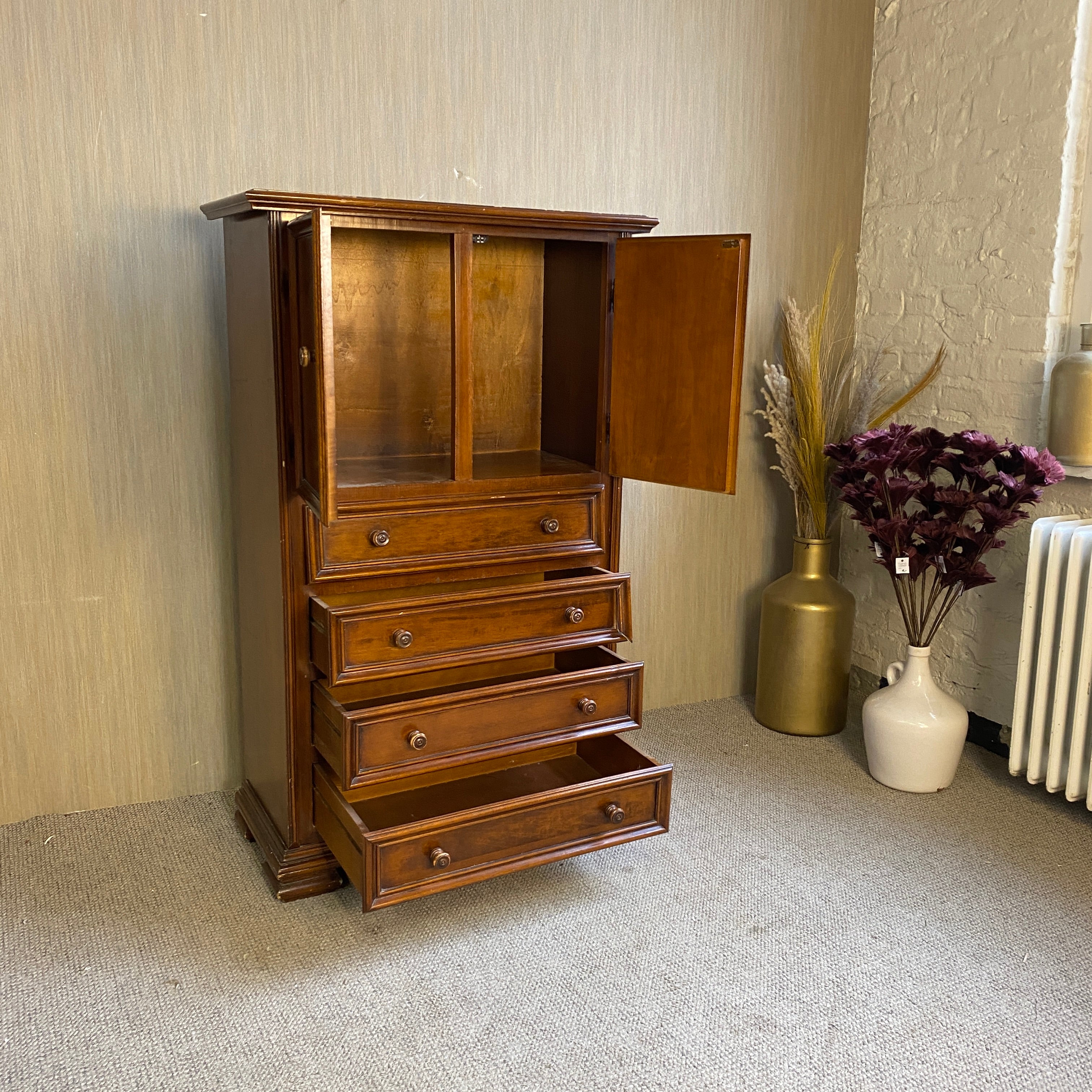 + Hoher Holzschrank im klassischen Vintage Stil mit zwei Türen und mehreren Schubladen.