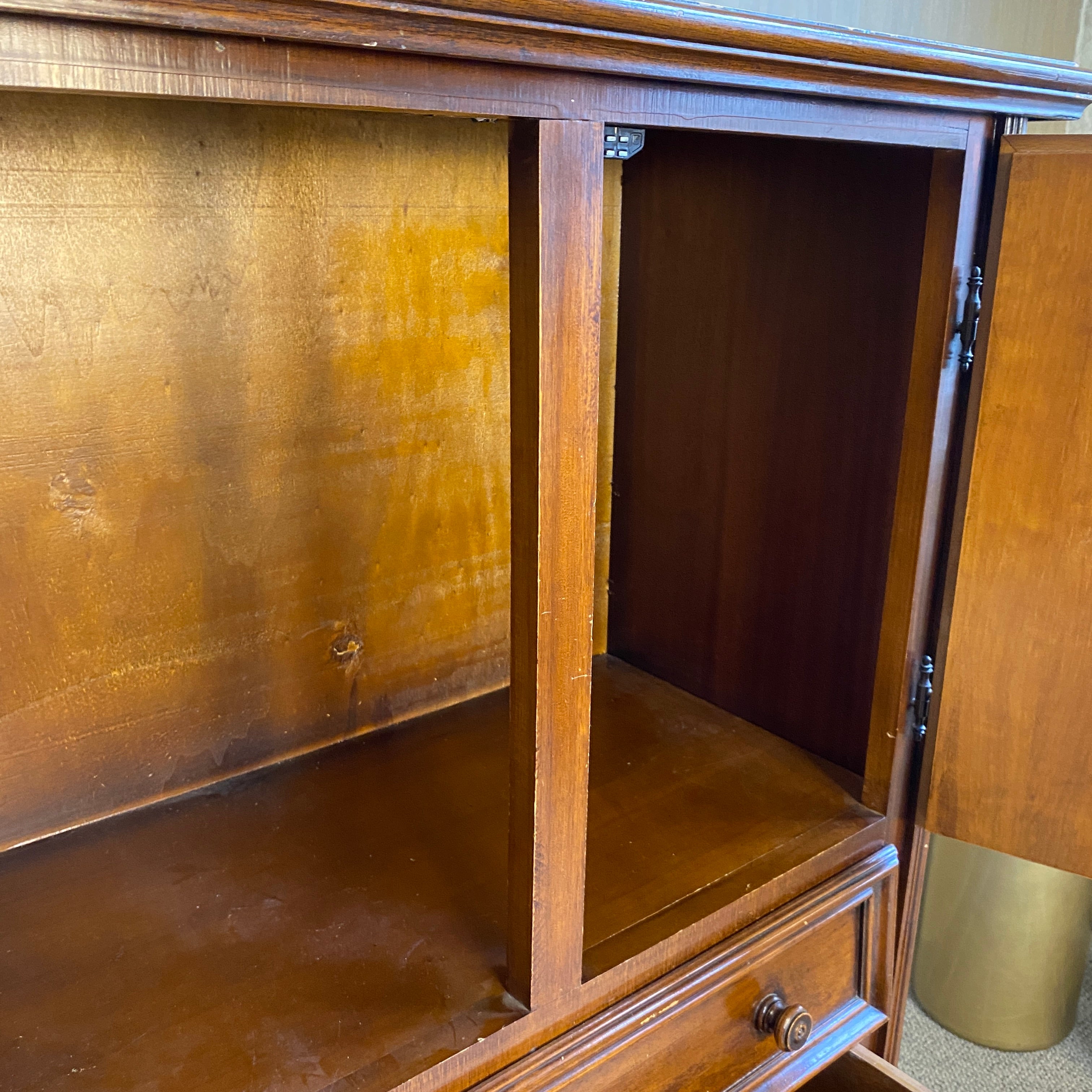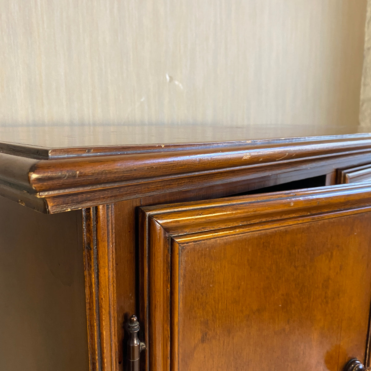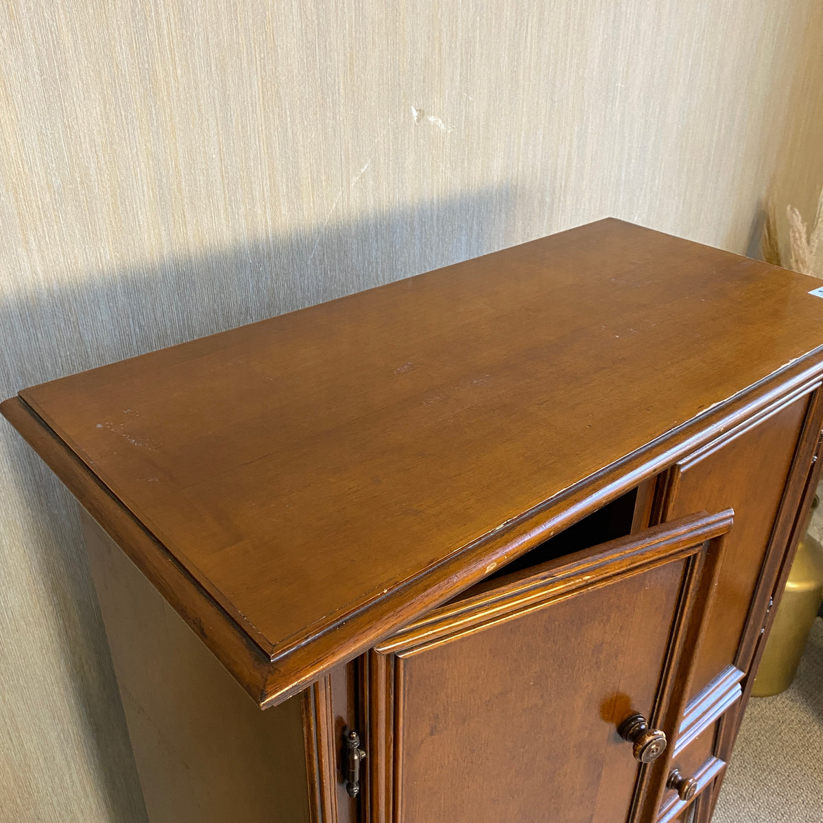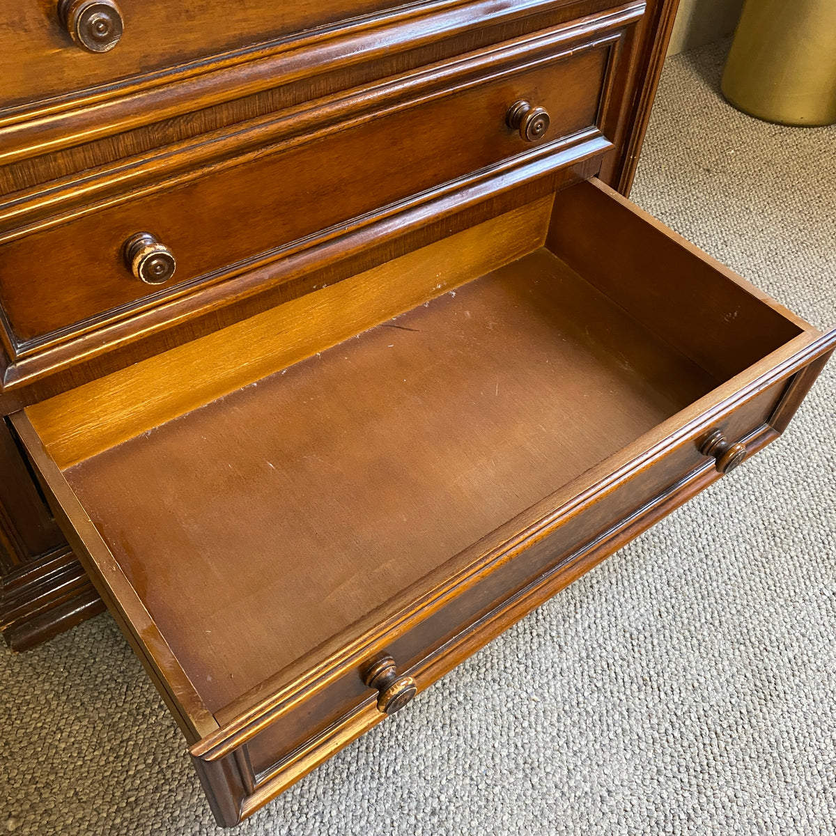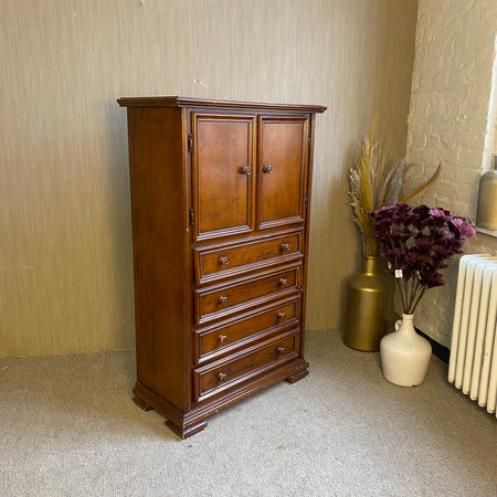 + Hoher Holzschrank im klassischen Vintage Stil mit zwei Türen und mehreren Schubladen.