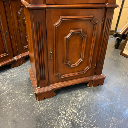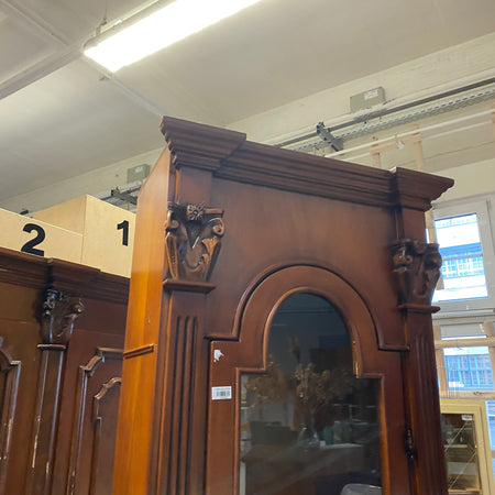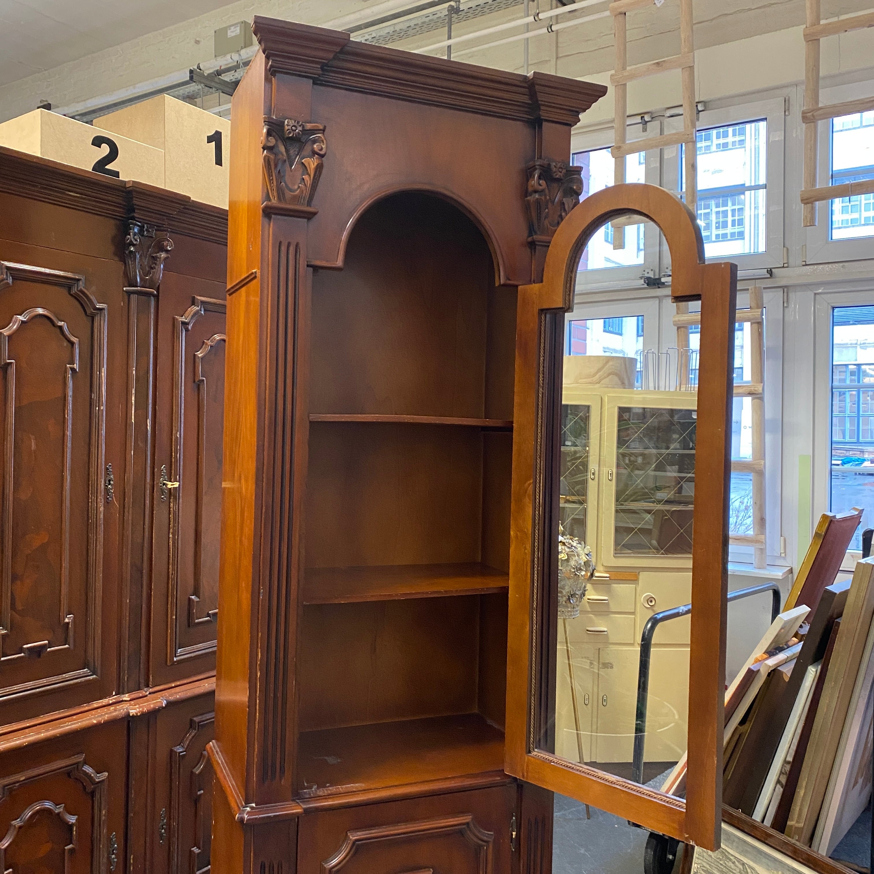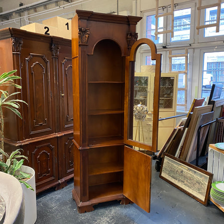 + Massiv gearbeitete Holz-Standvitrine im klassischen Landhausstil mit dekorativer Glastür.