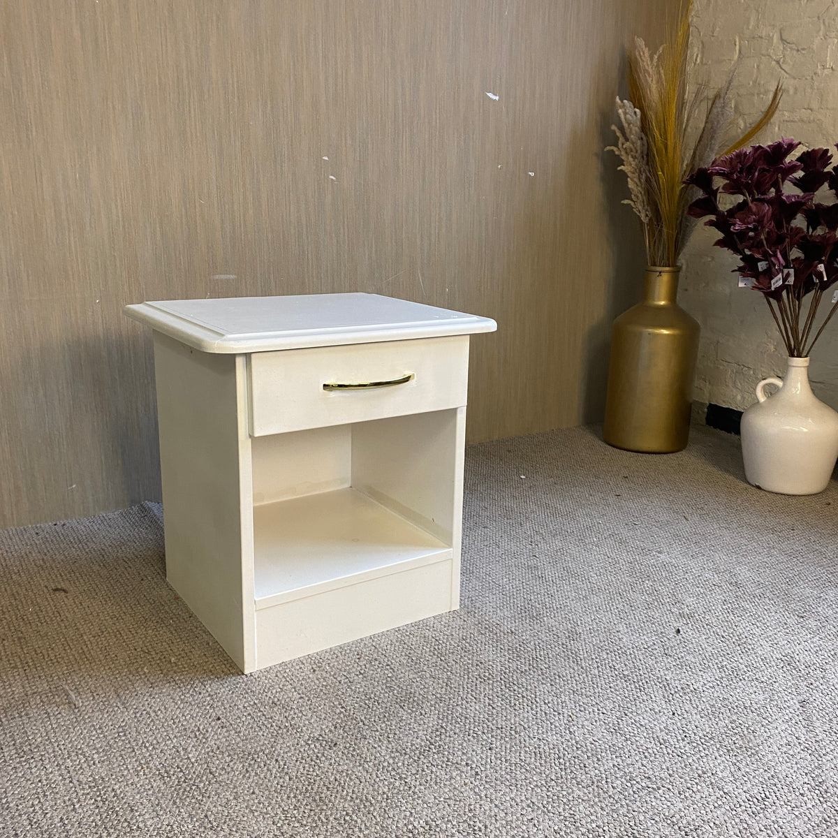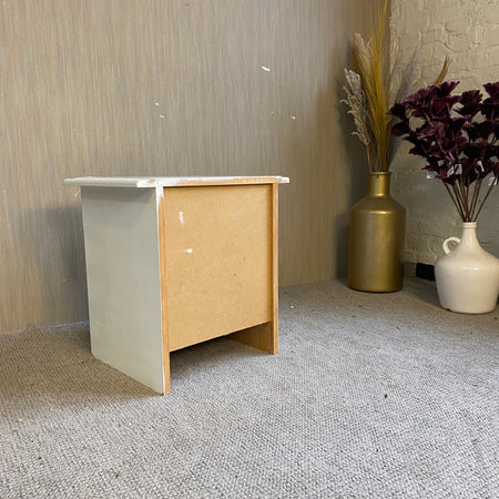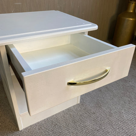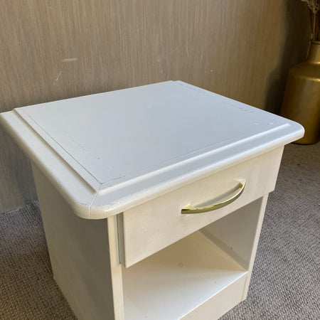 + Weißer Nachttisch im klassischen Stil mit praktischer Schublade und offenem Fach.