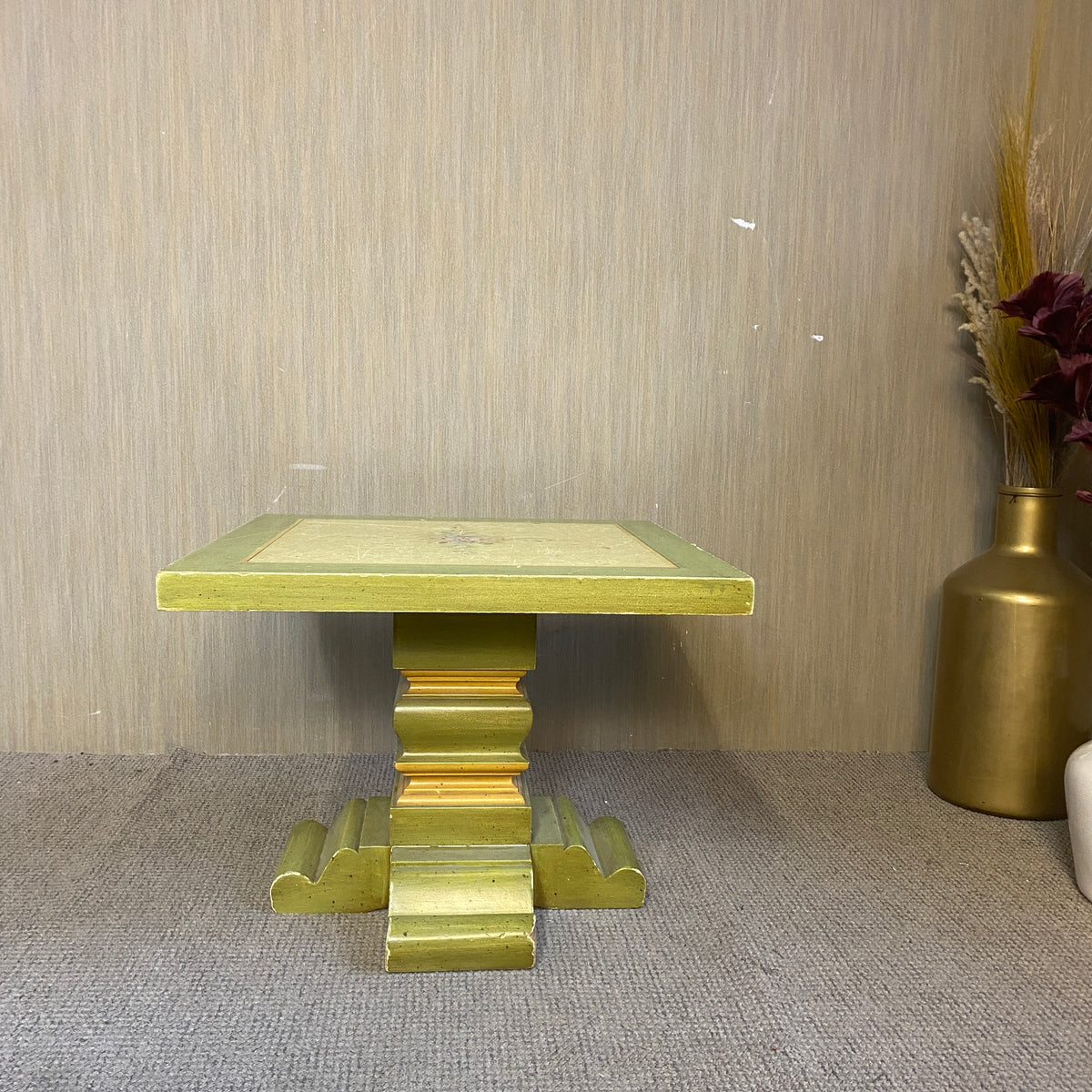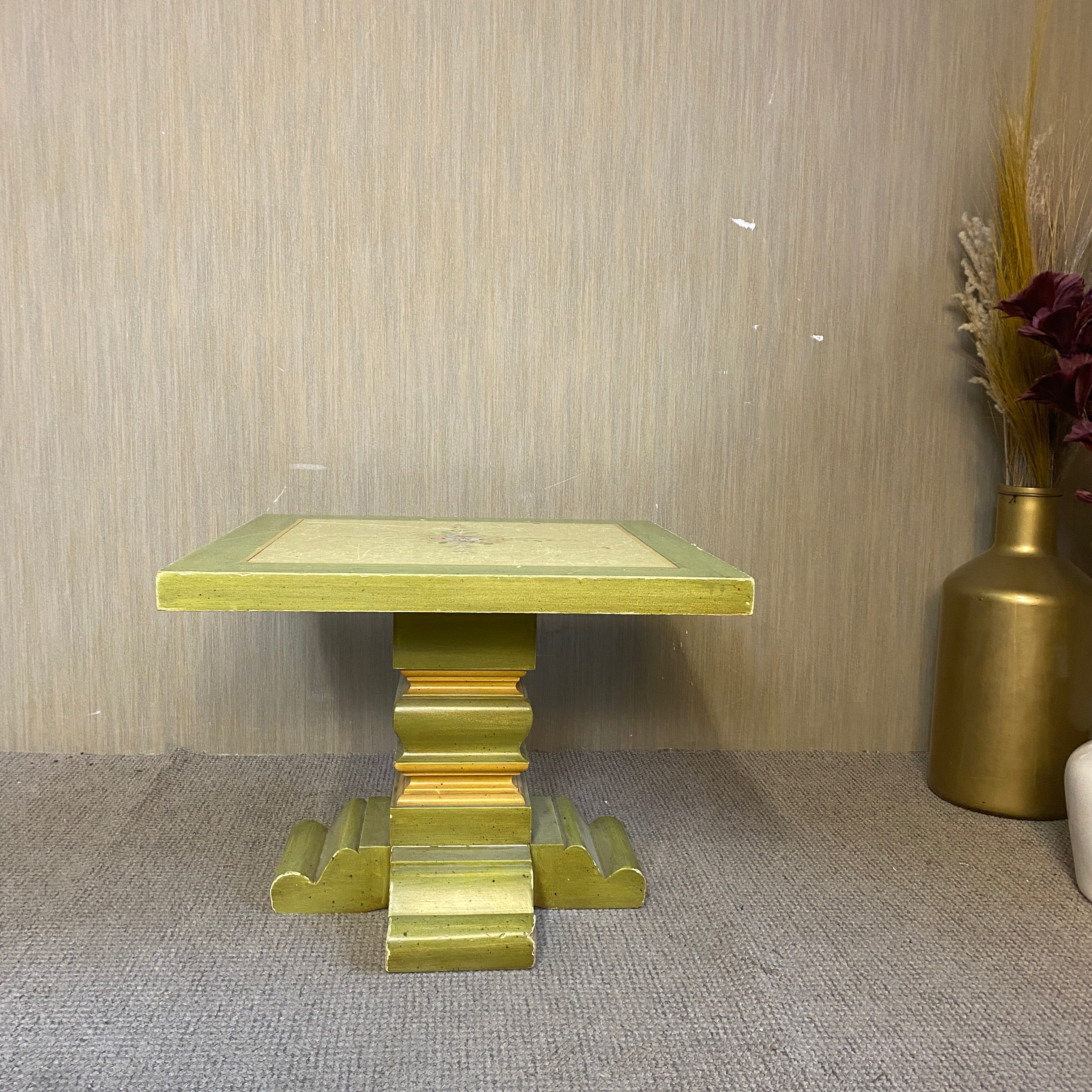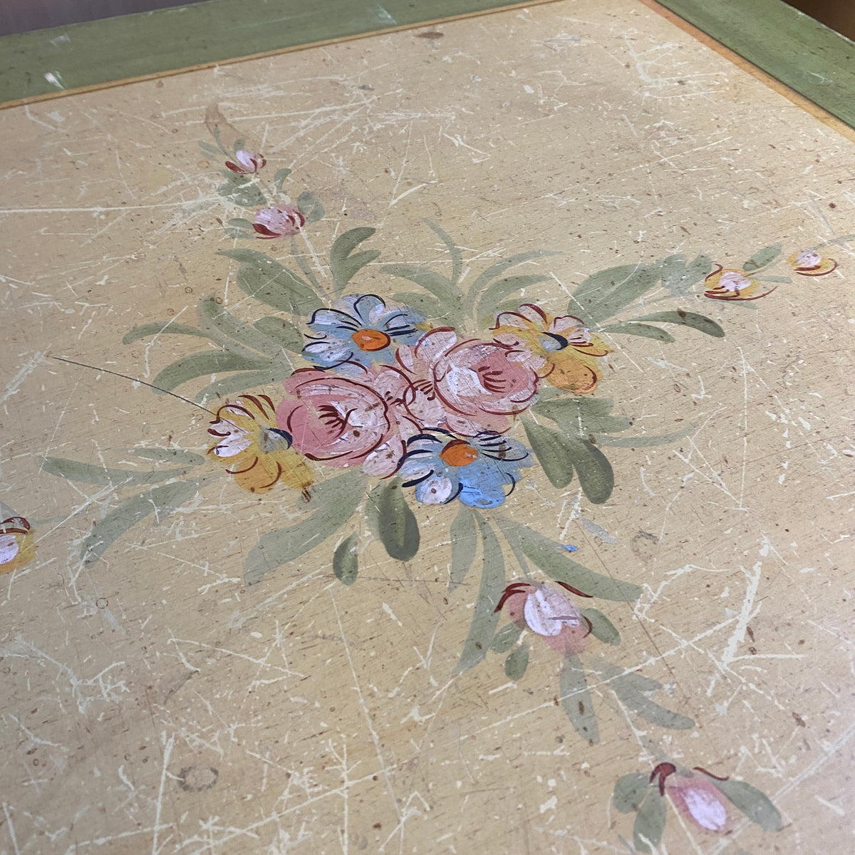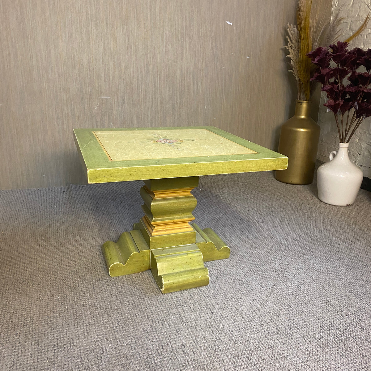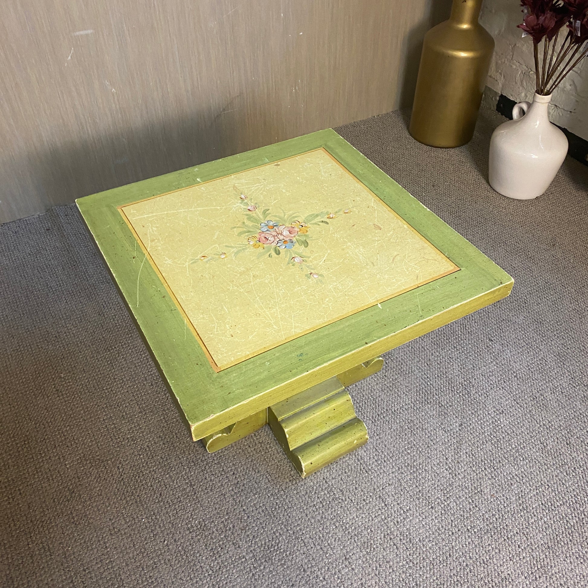 + Dekorativer Vintage Beistelltisch in frischem Grün, handbemalt mit floralem Motiv.