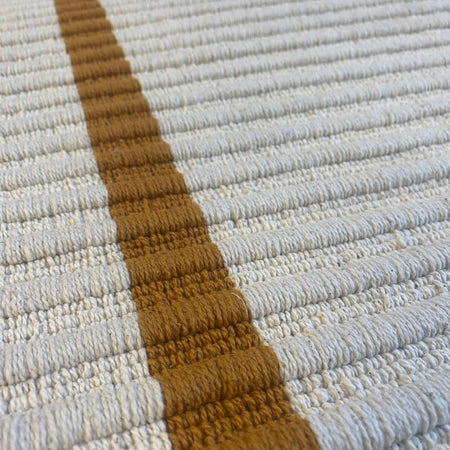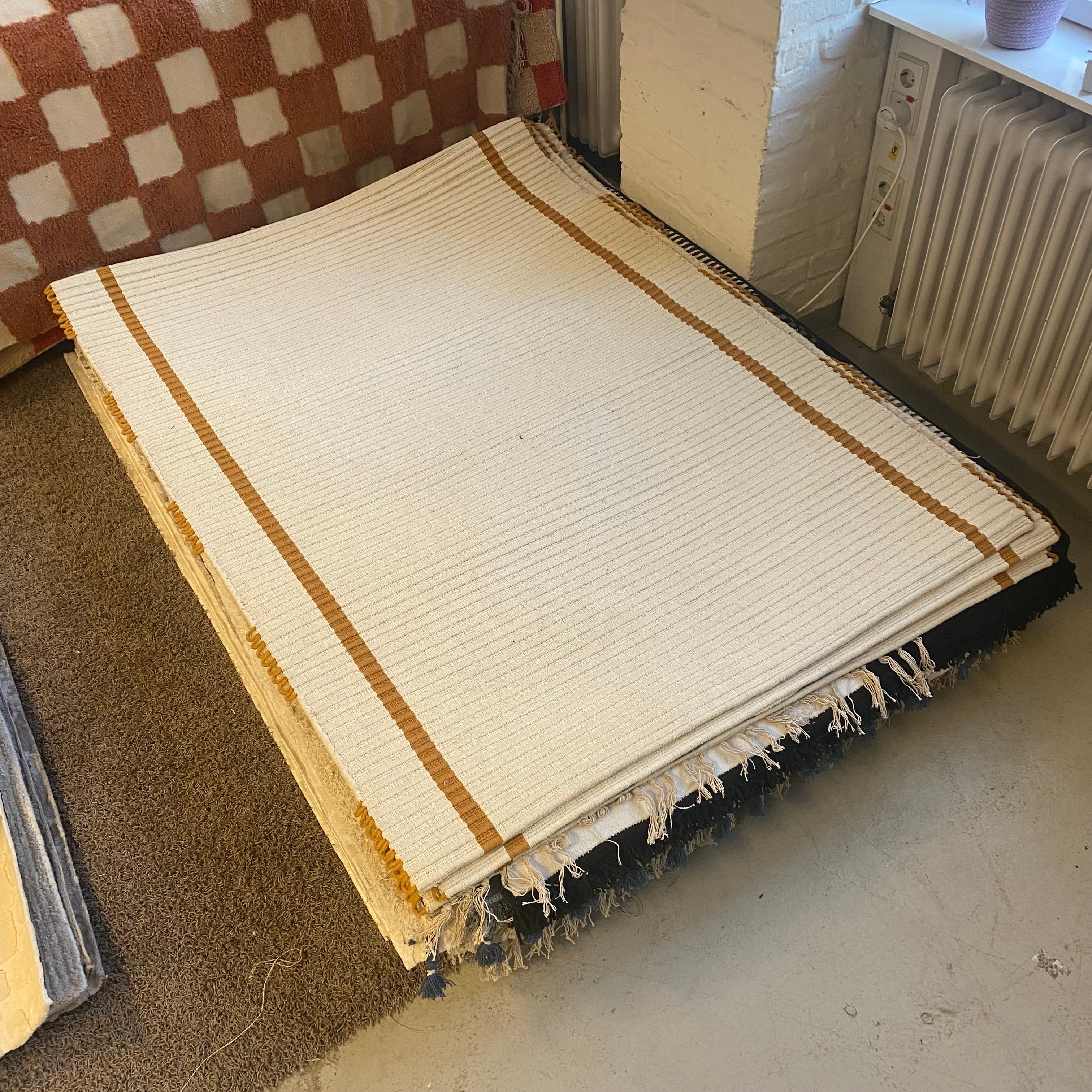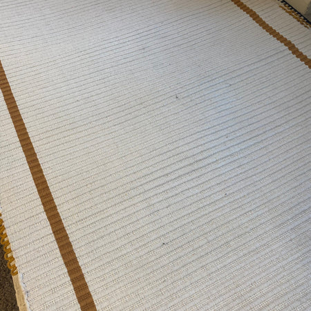 + Heller Teppich in Creme mit dezenten beigefarbenen Streifen.