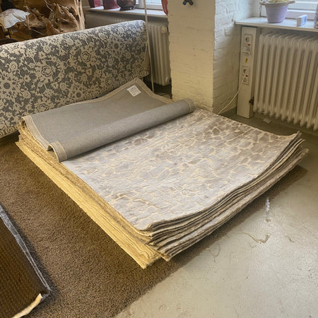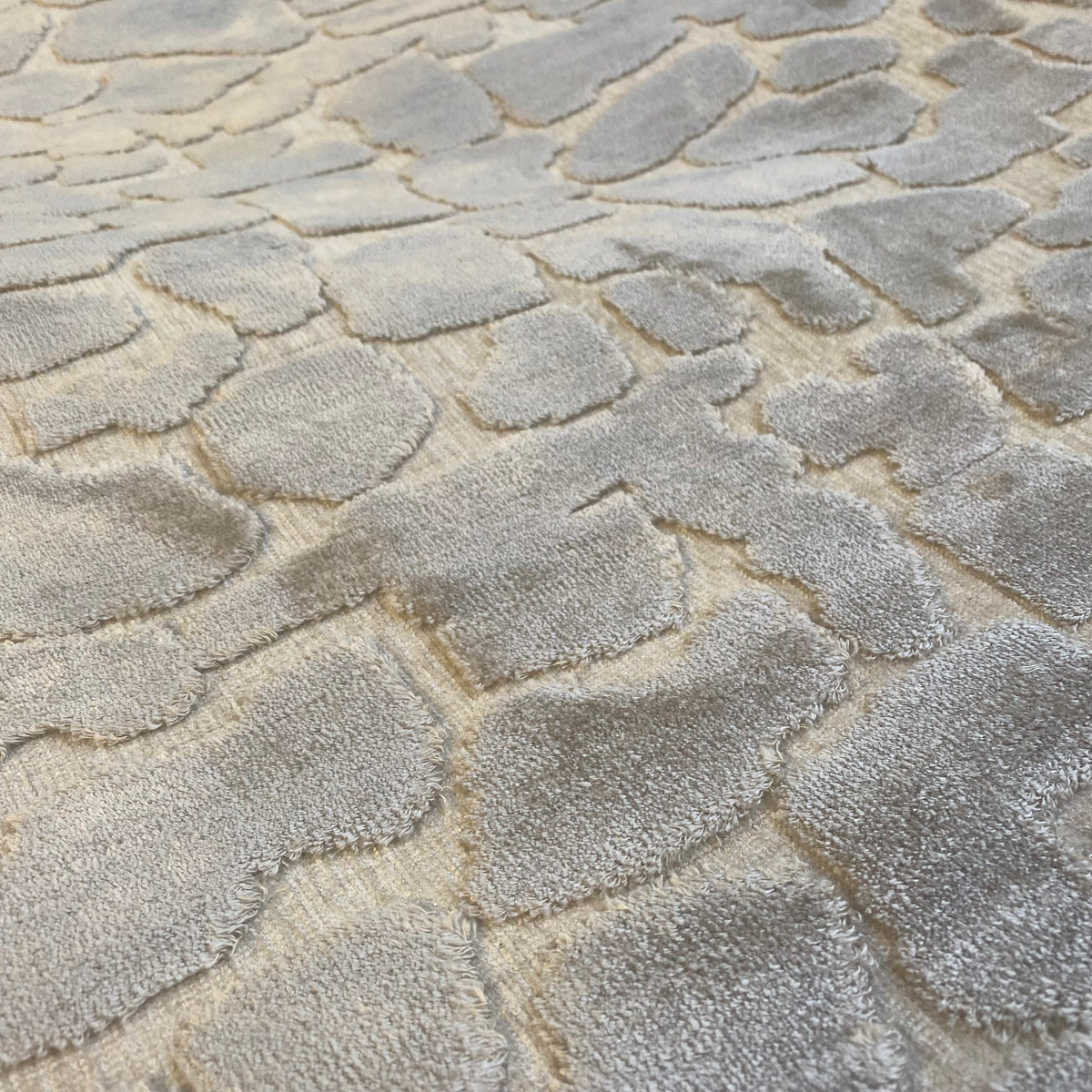 + Moderner Teppich in Cremeg und Grau mit strukturierter Steinoptik.