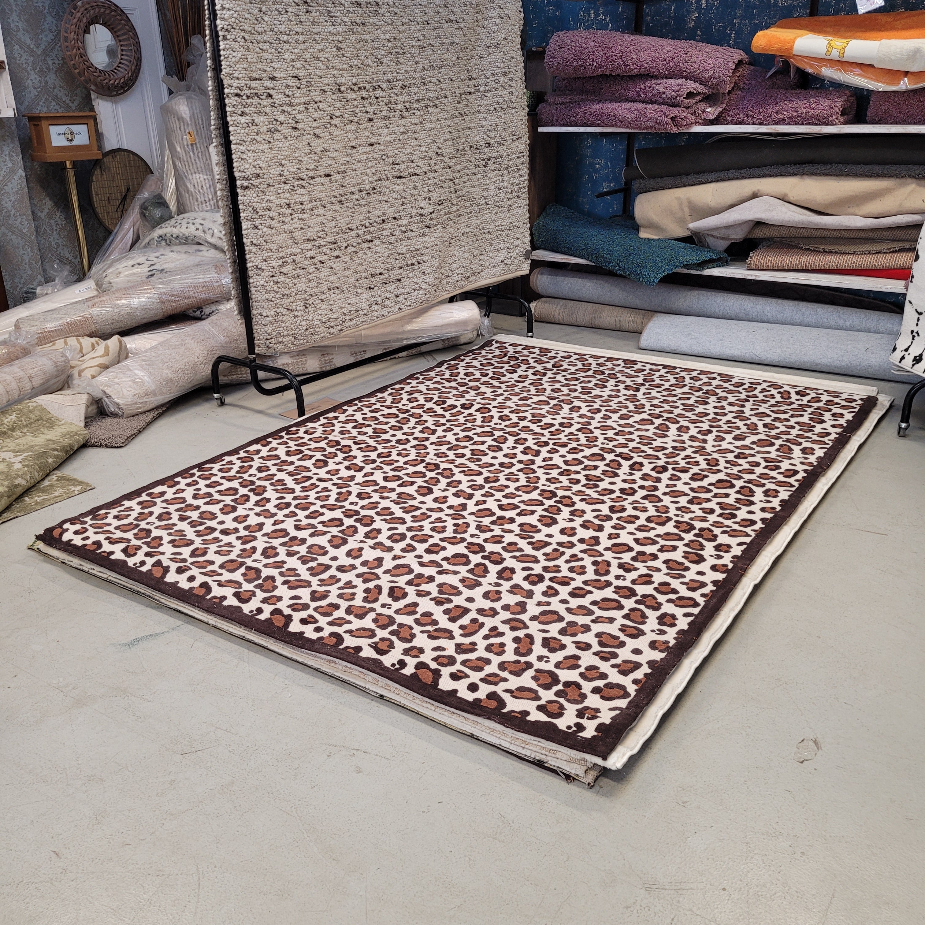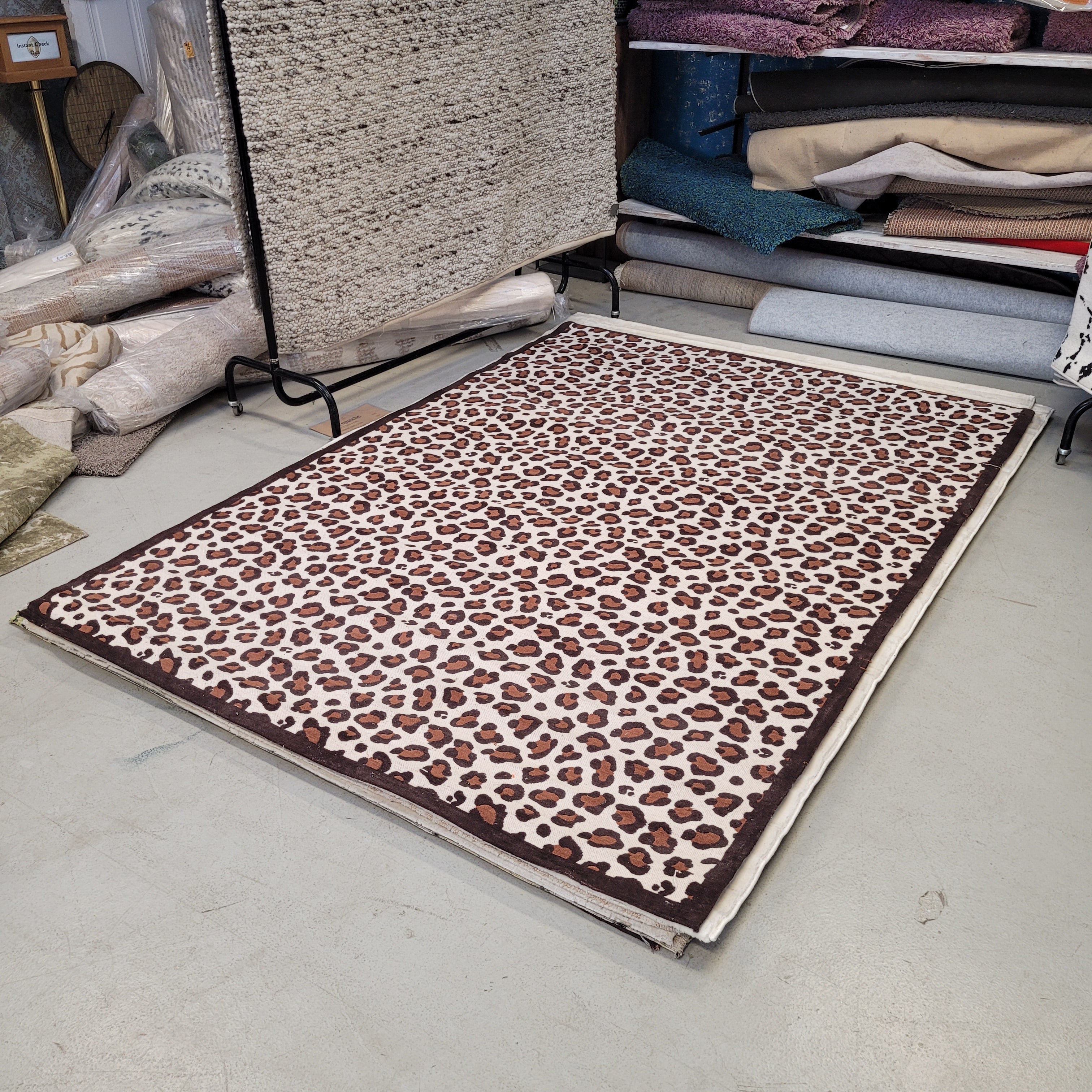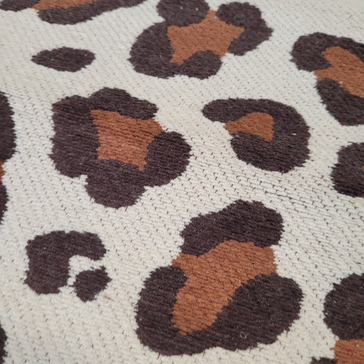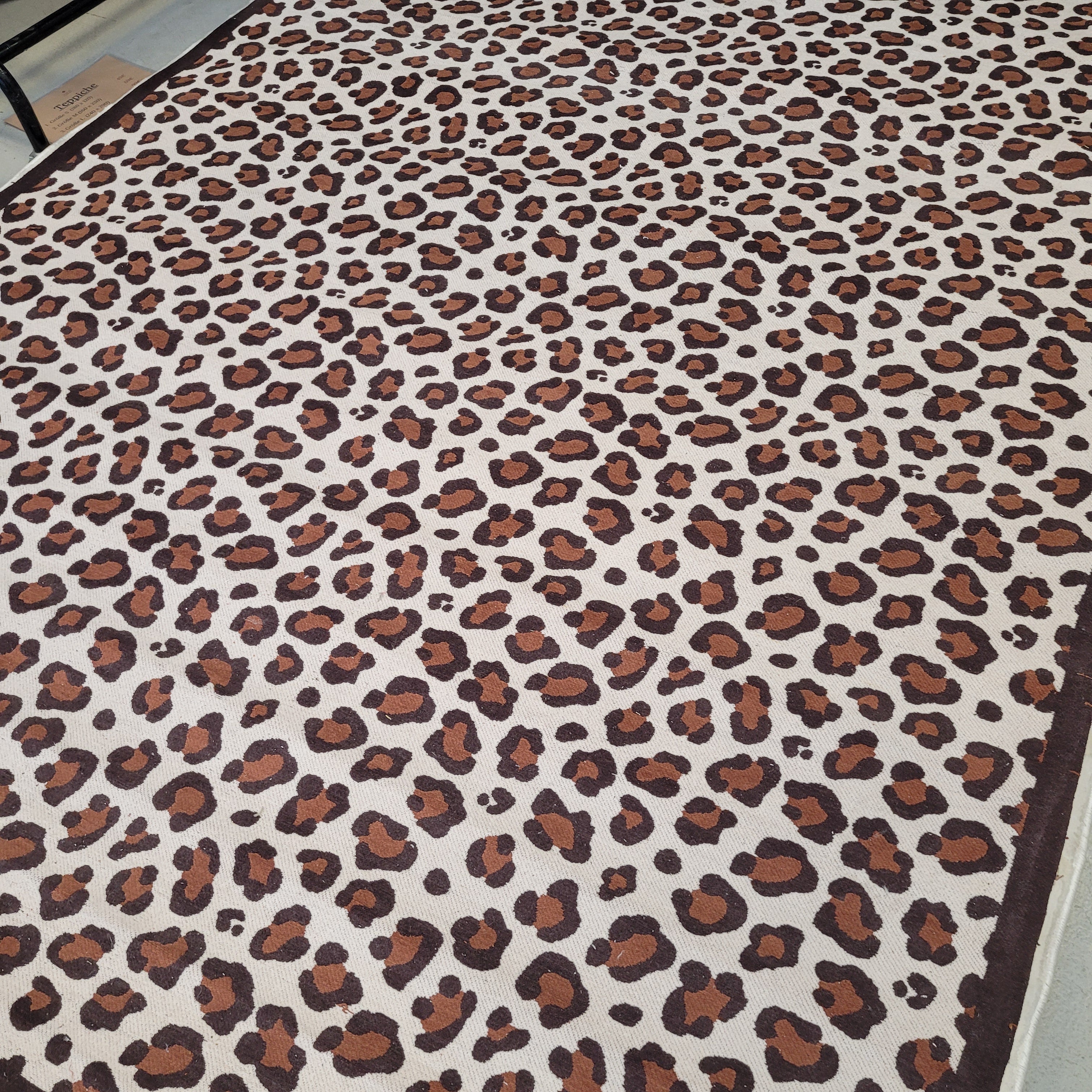 + Moderner Teppich in Braun und Creme mit markantem Leopardenmuster.