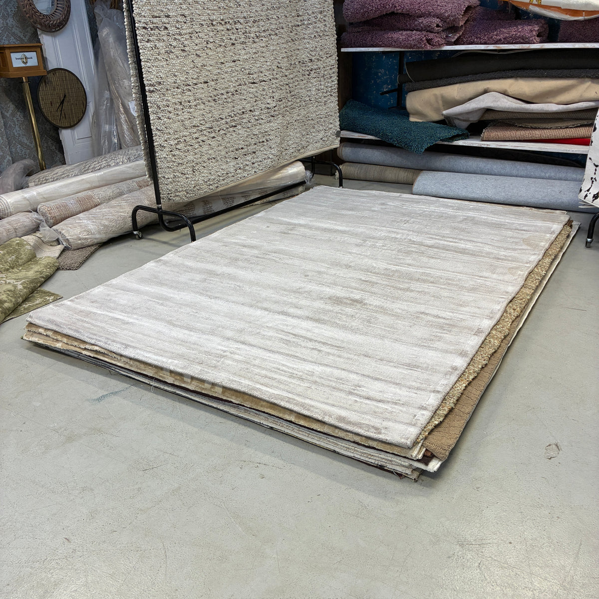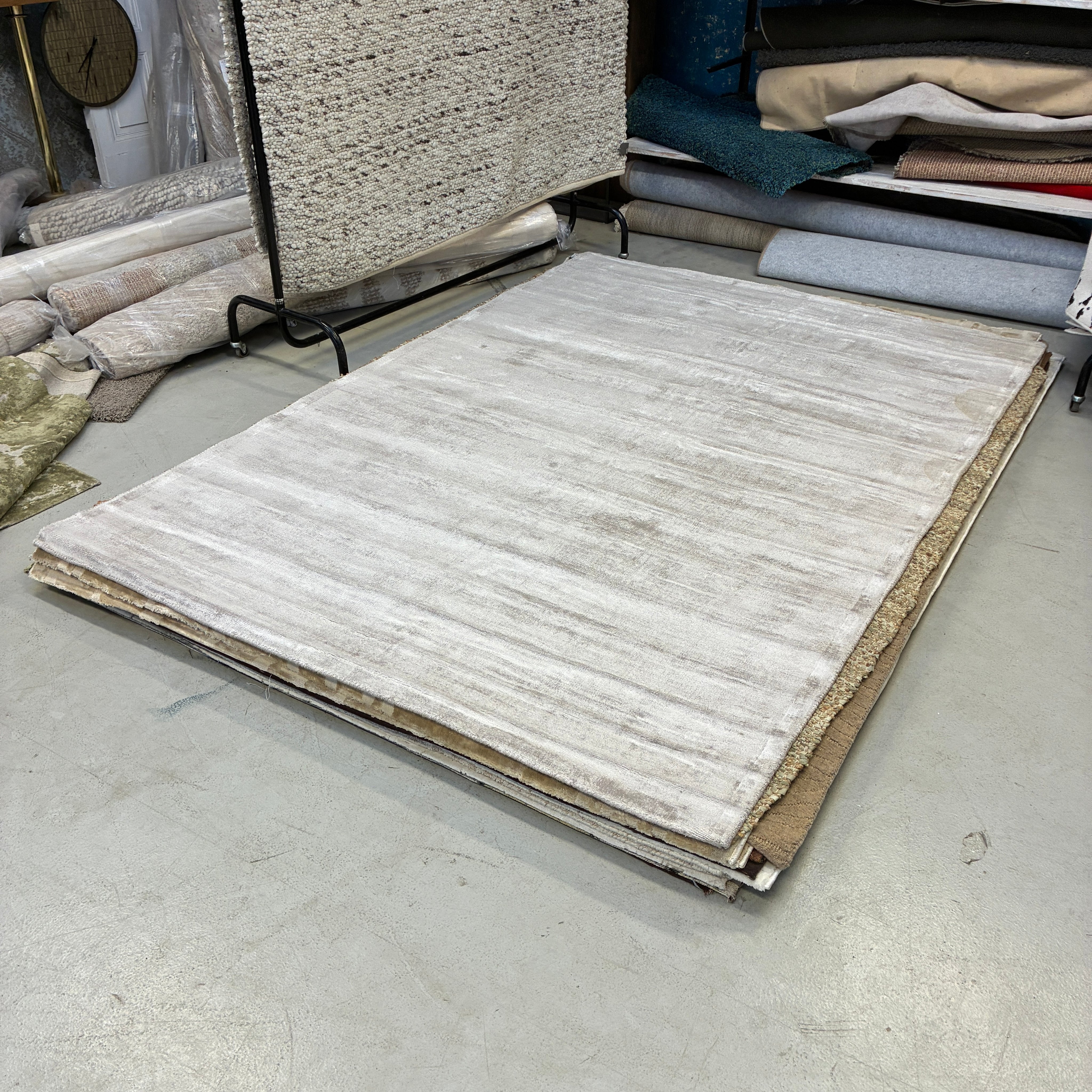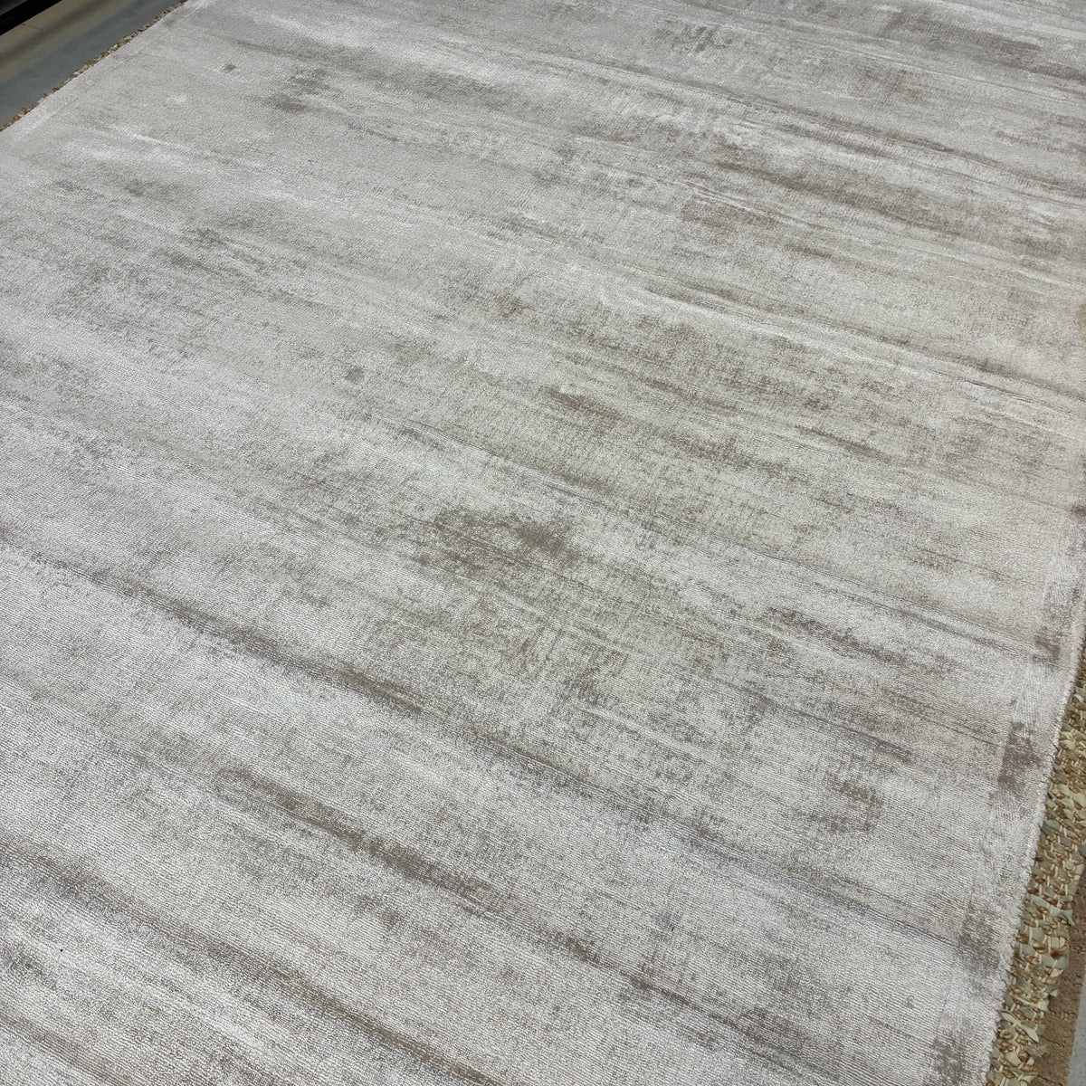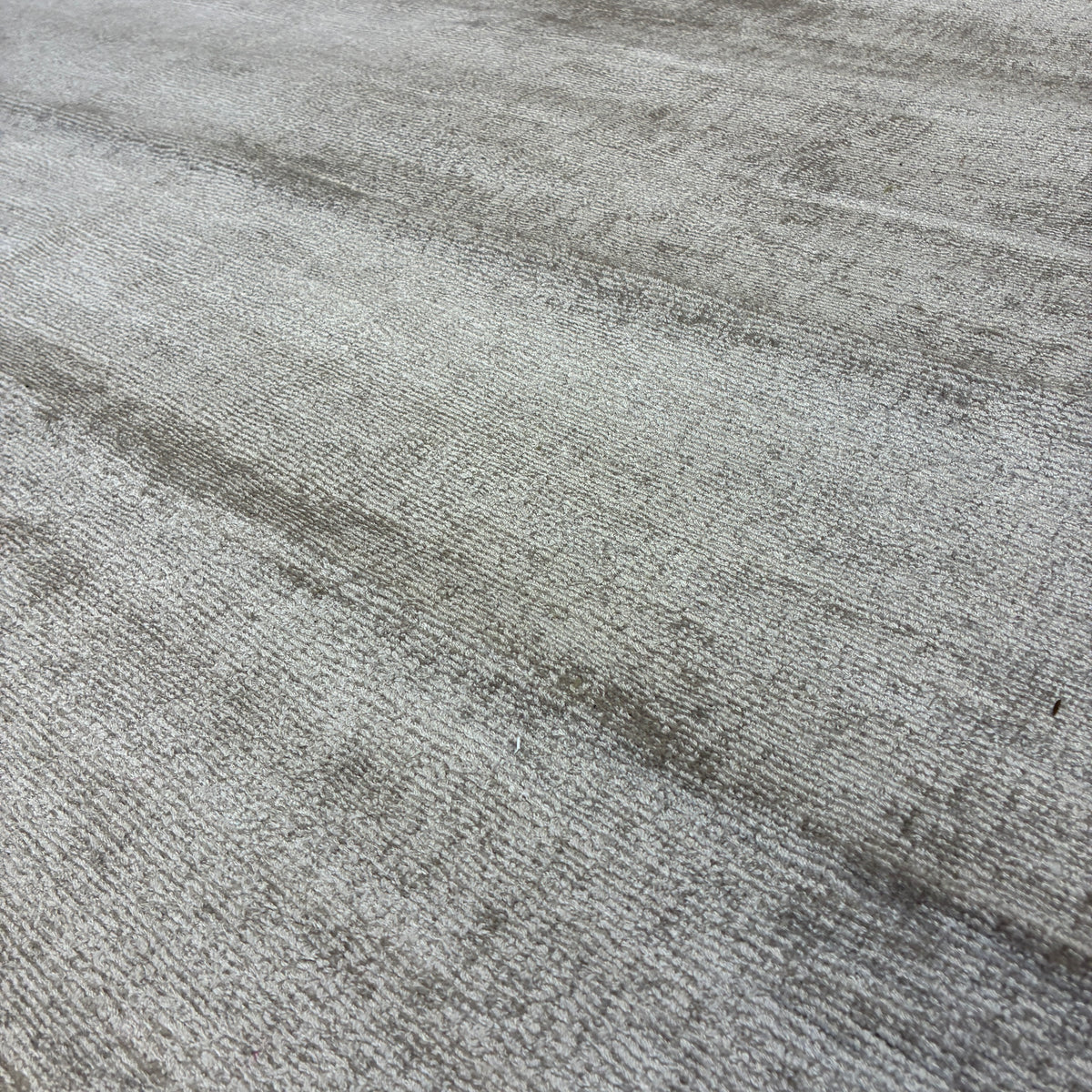 + Moderner Teppich in Grau- und Beigetönen mit ruhiger Uni-Optik.