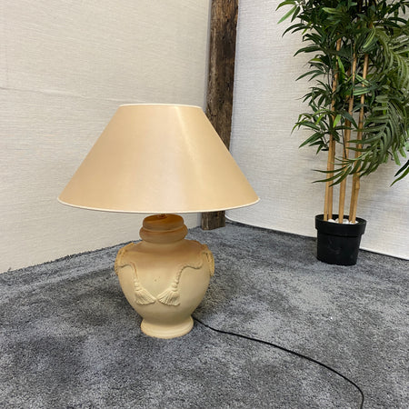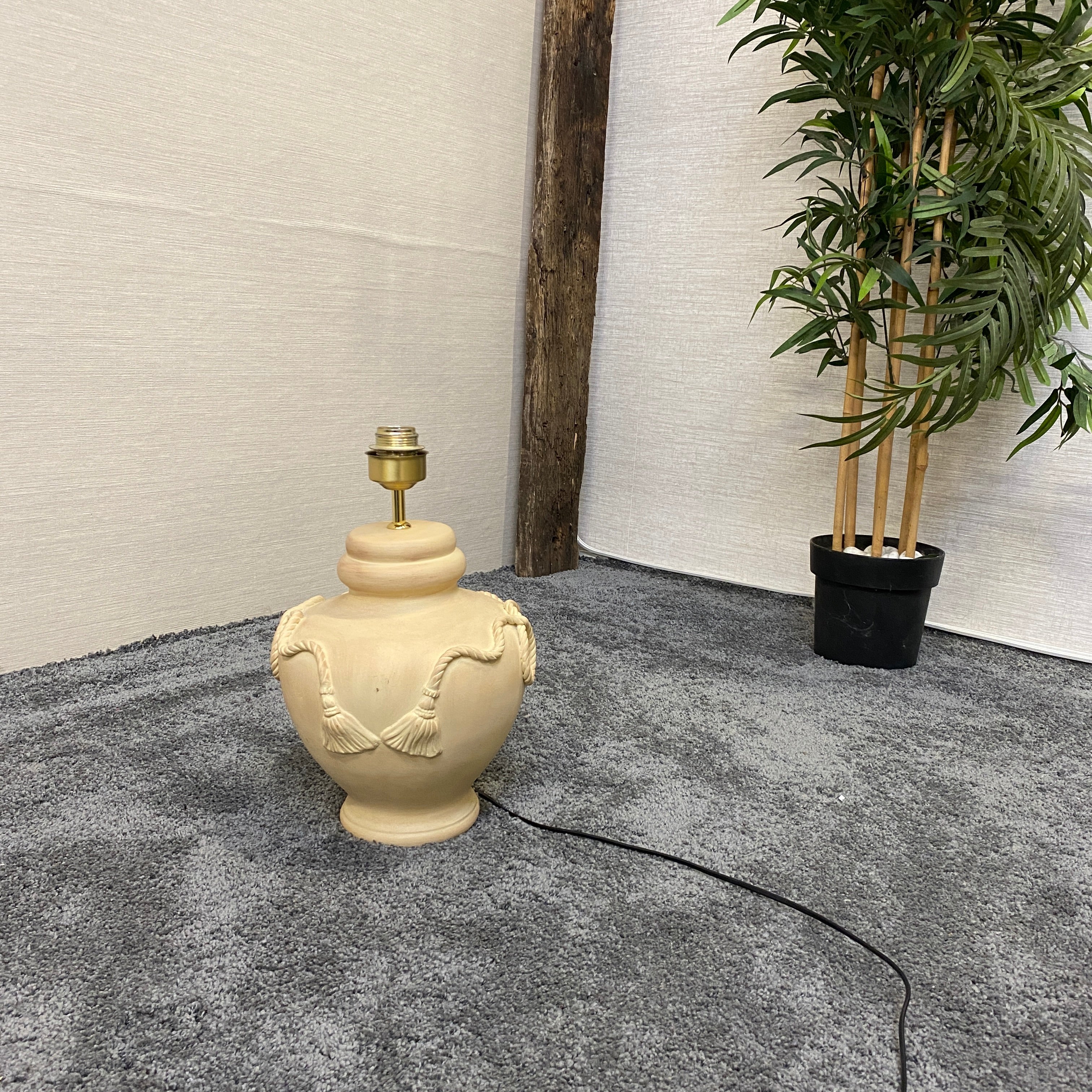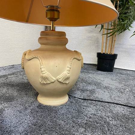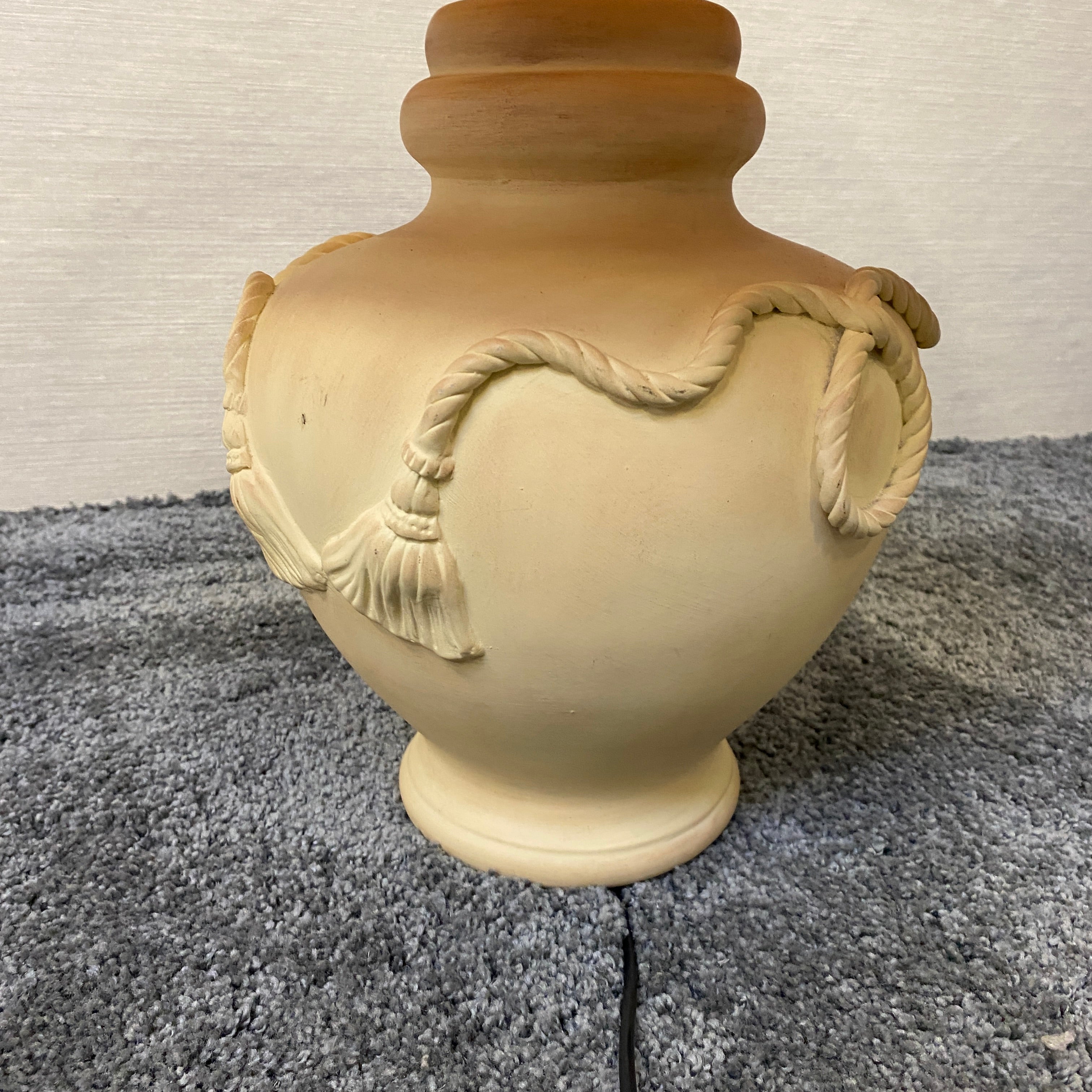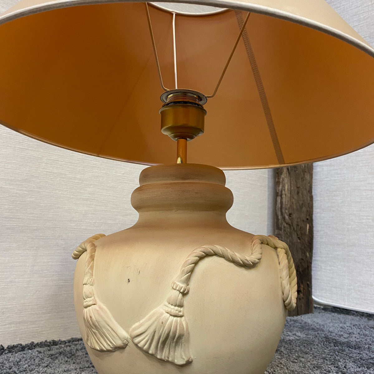 + Stilvolle Vintage-Tischlampe mit dekorativem Keramikfuß und eleganten Relief-Details (Tassel-/Kordeloptik