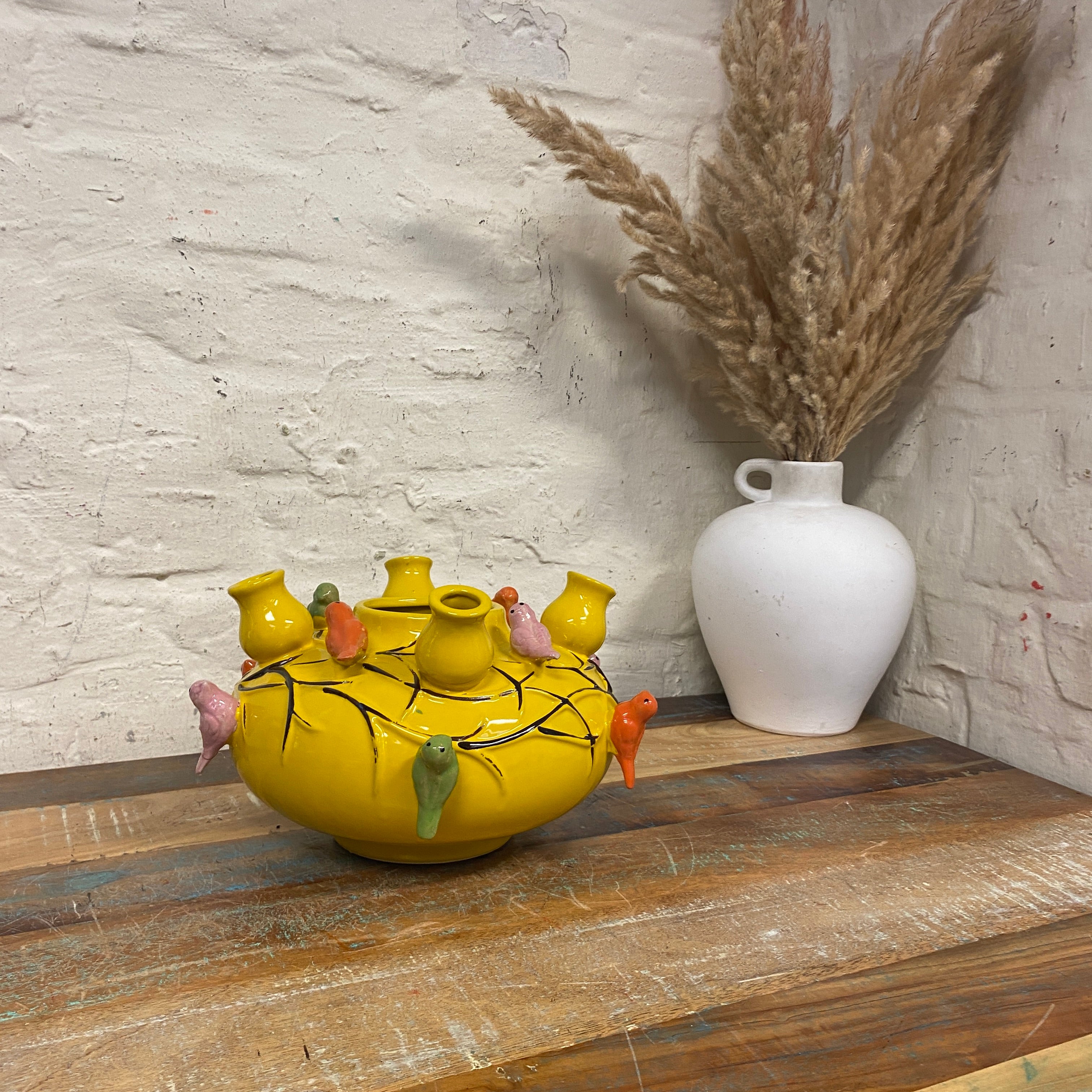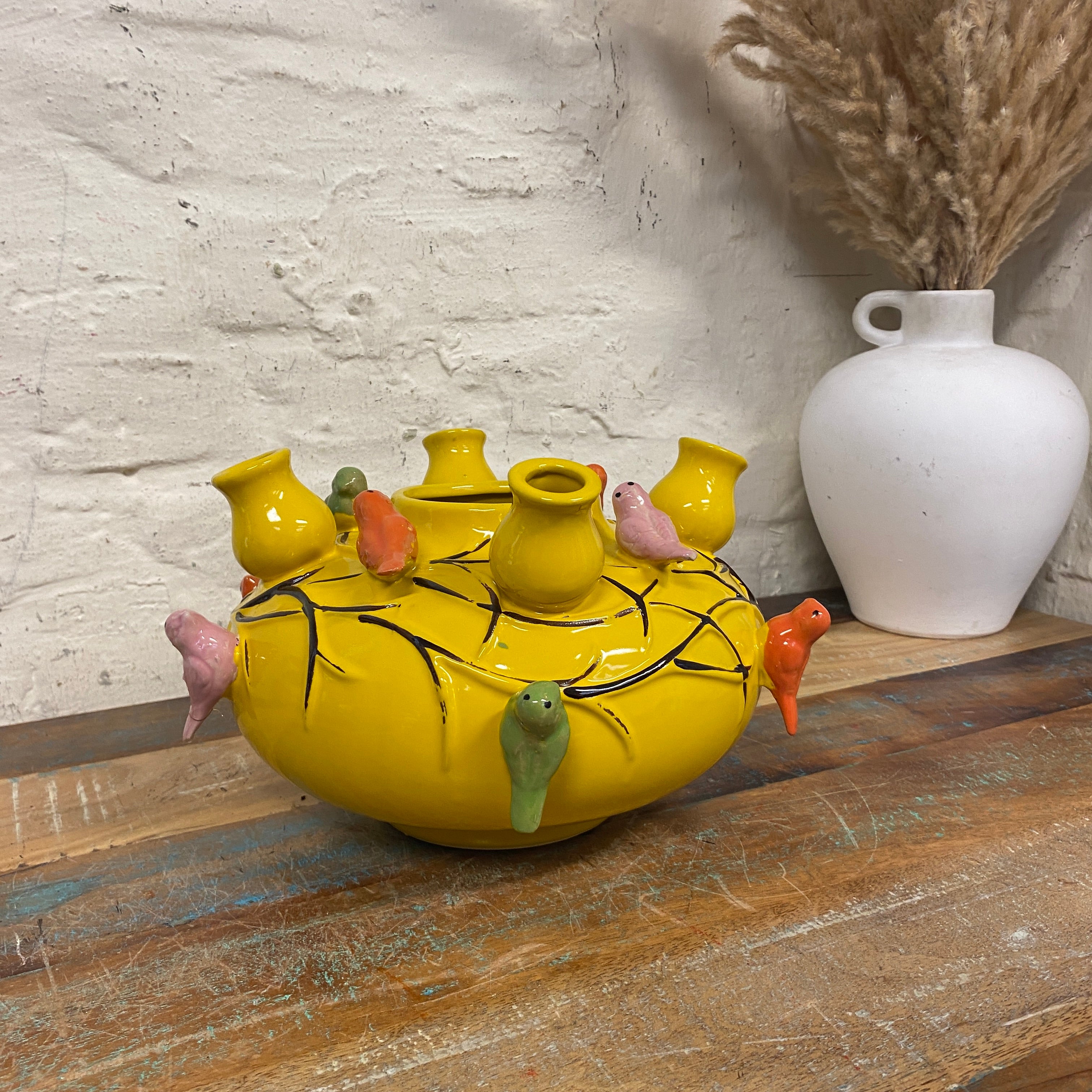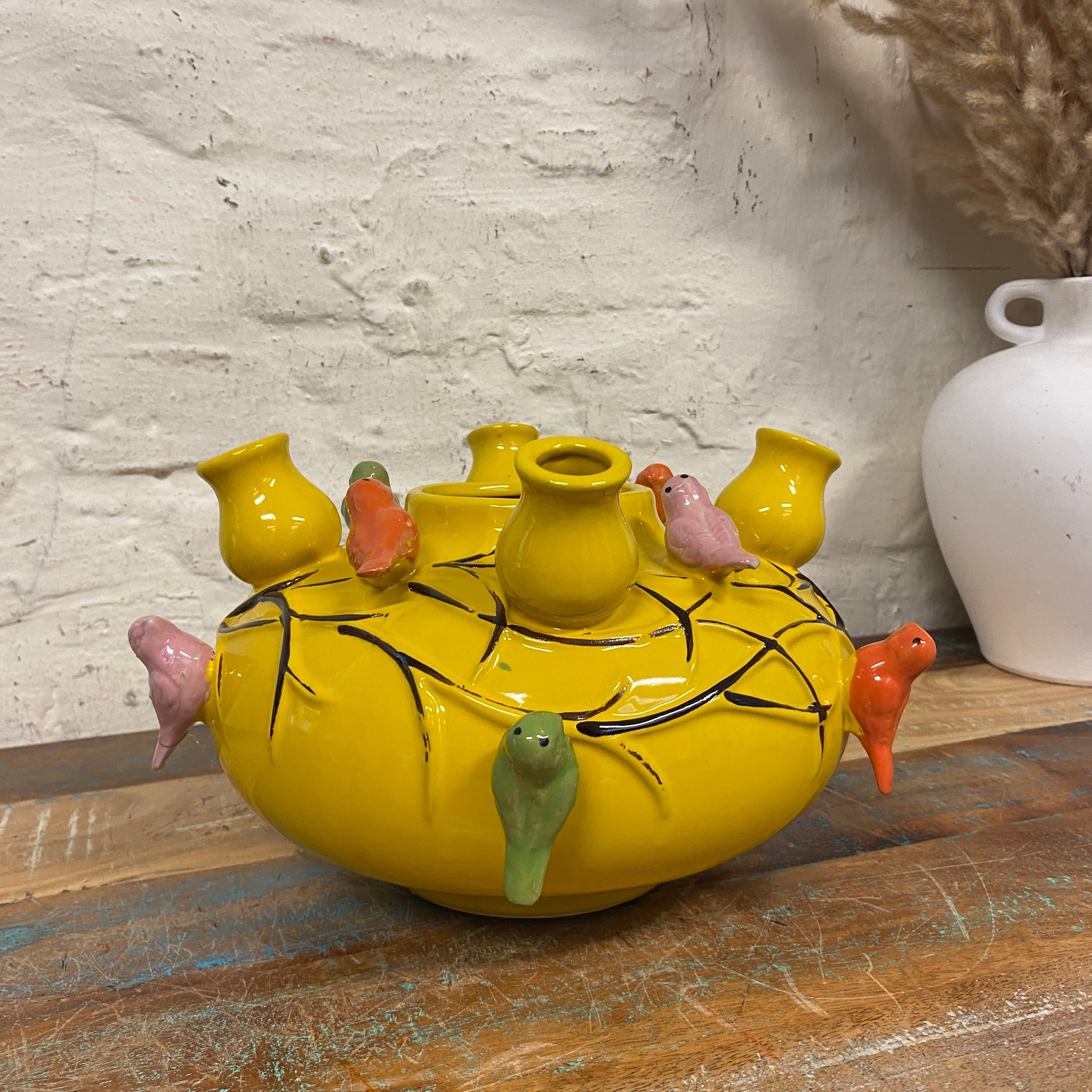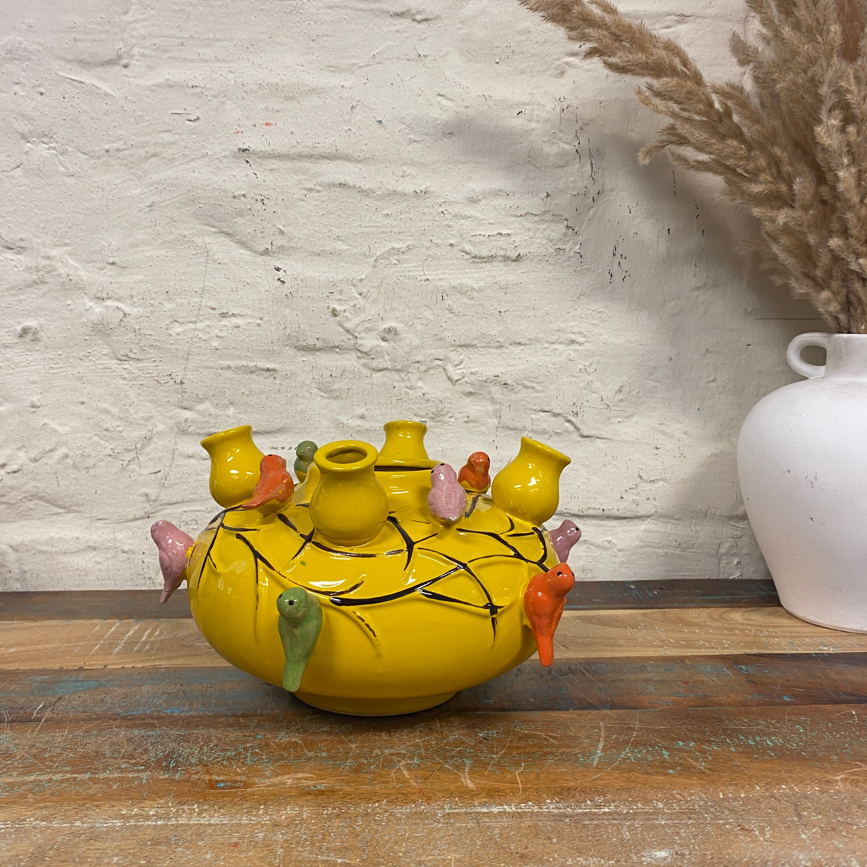 + in knalligem Gelb mit bunten Vögeln