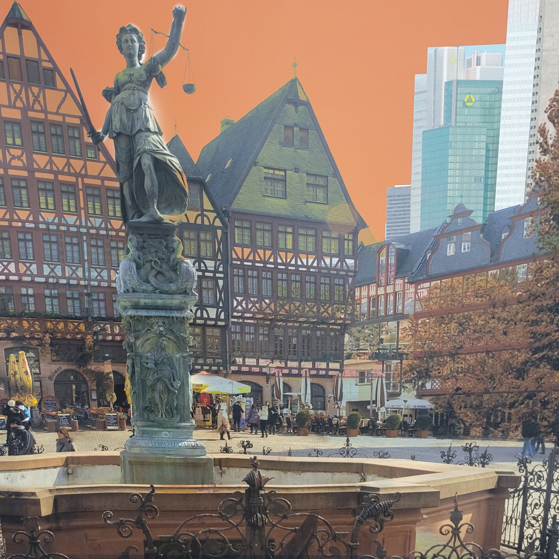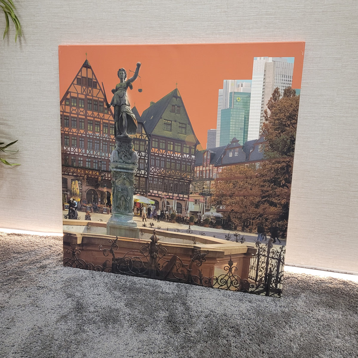 + Großformatiges Leinwandbild mit Motiv des Frankfurter Römerbergs und dem berühmten Gerechtigkeitsbrunnen